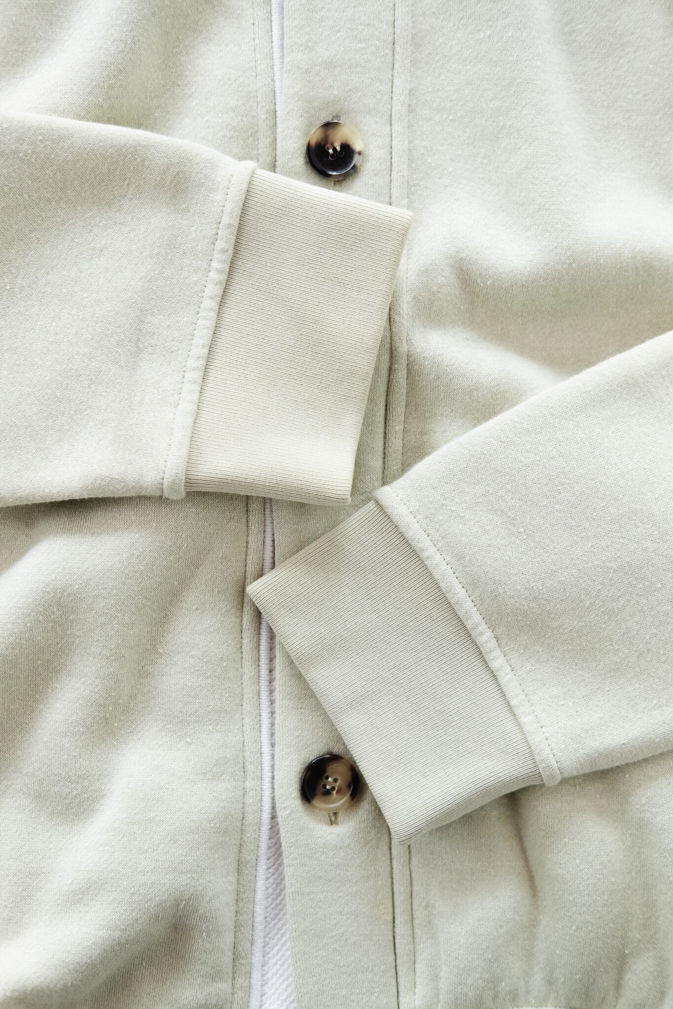 加えて、触れた瞬間に感じる独特の質感。外観は一見スウェット、しかし裏面の起毛にはリネン特有のさらりとしたタッチが漂い、コットン100%とも、コットン×ポリとも違う肌当たりを実現しています。