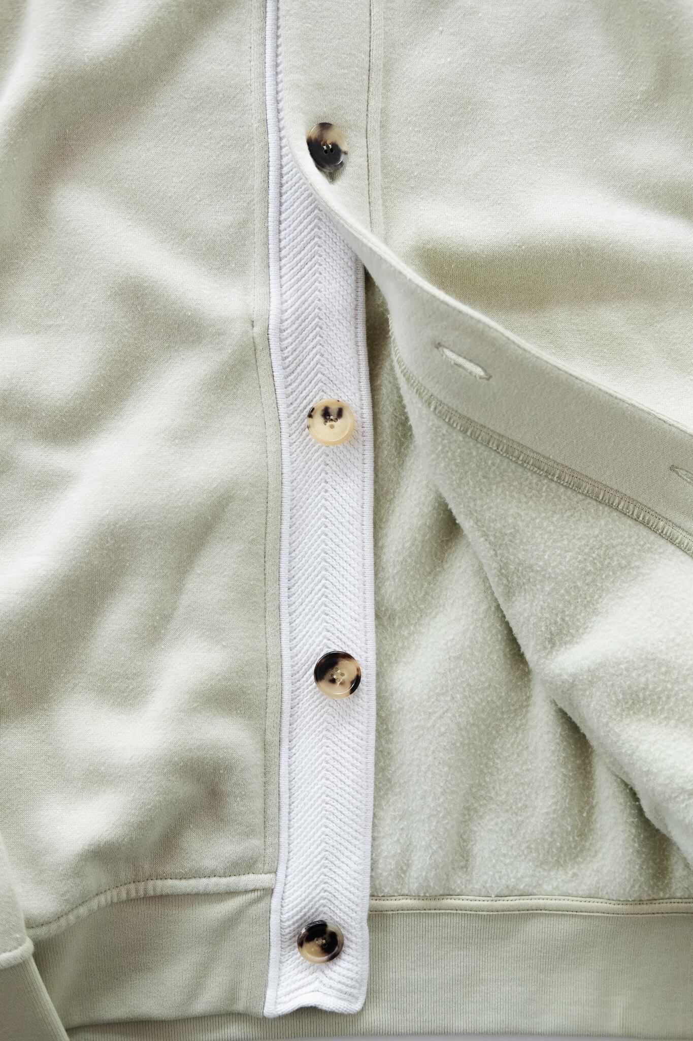 さらに、前立て裏にも注目。ホワイトのコットンテープが丁寧に縫い込まれ、ボタンを留めた時も外した時も、端正な佇まいを保ちます。