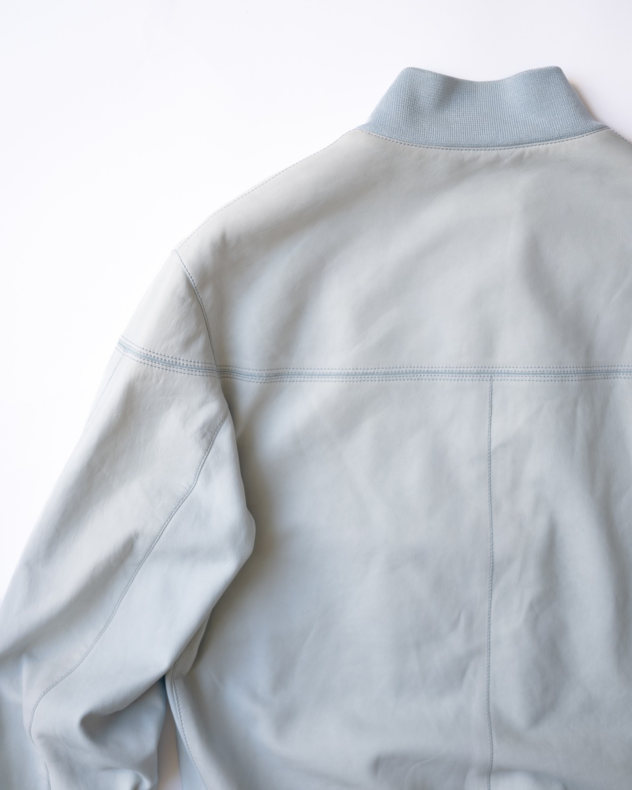驚くほど柔らかく、手に吸い付くようなタッチは、まさに「第二の肌」とも呼ぶべき上質さ。着るたびに身体に馴染み、自分だけの風合いへと育っていくマテリアルです。さらに特筆すべきは、その”シボ感”。ラムレザー特有のもっちりとした質感の中に佇む、マッシブなシボは、豊かな表情と奥行きを生み出しています。こうしたナチュラルグレインが、過度な加工を避けた素材本来の美しさを物語っていますね。
