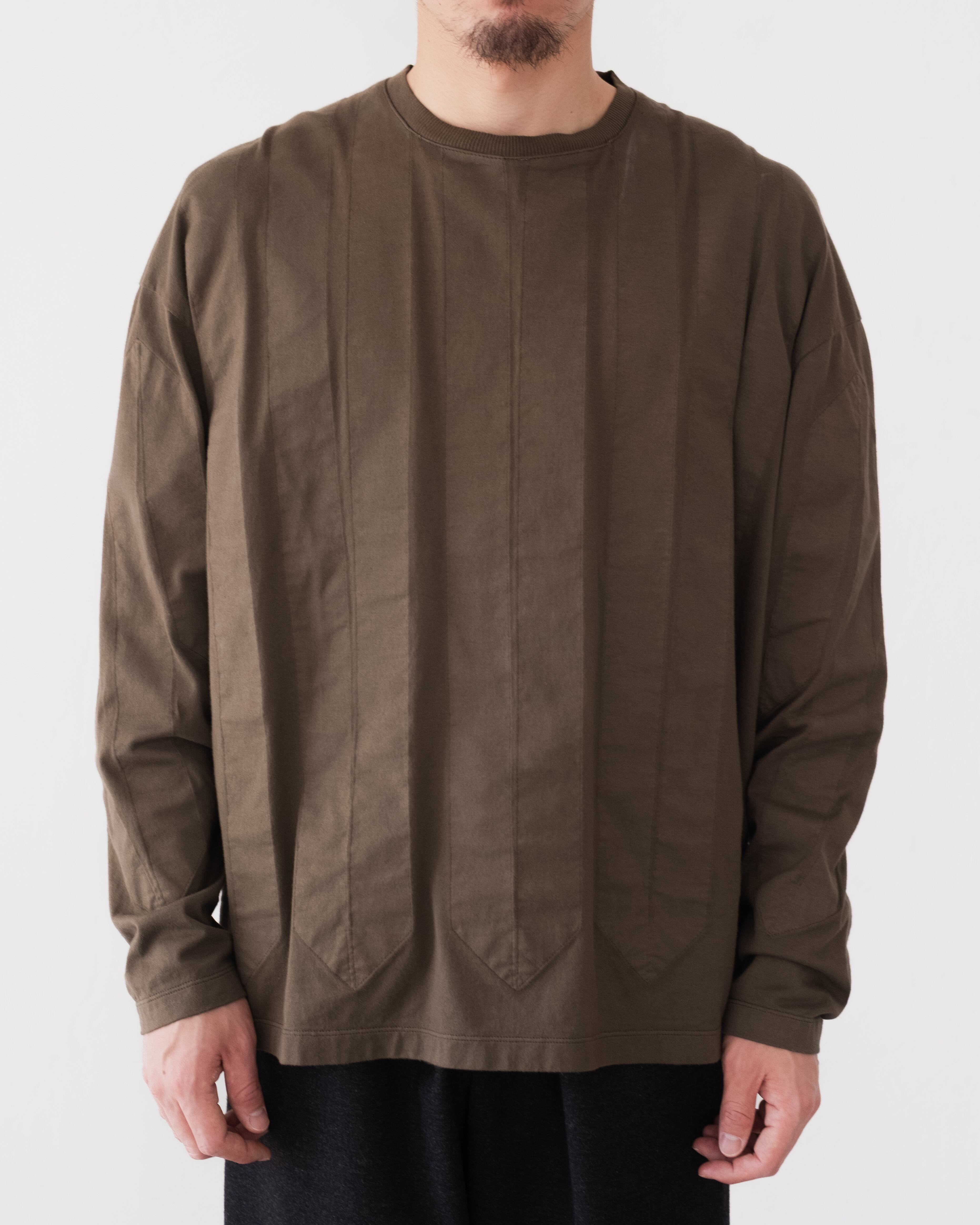 素材同士を対比的に扱うことで、視覚と触覚の両面から服に奥行きを与えることを得意とし、この一着もまたその延長線上にあり、装飾を廃したフォルムの中に構造的奥行きを潜ませるという、まさに沈黙のインテリジェンスを象徴するカットソーになります。