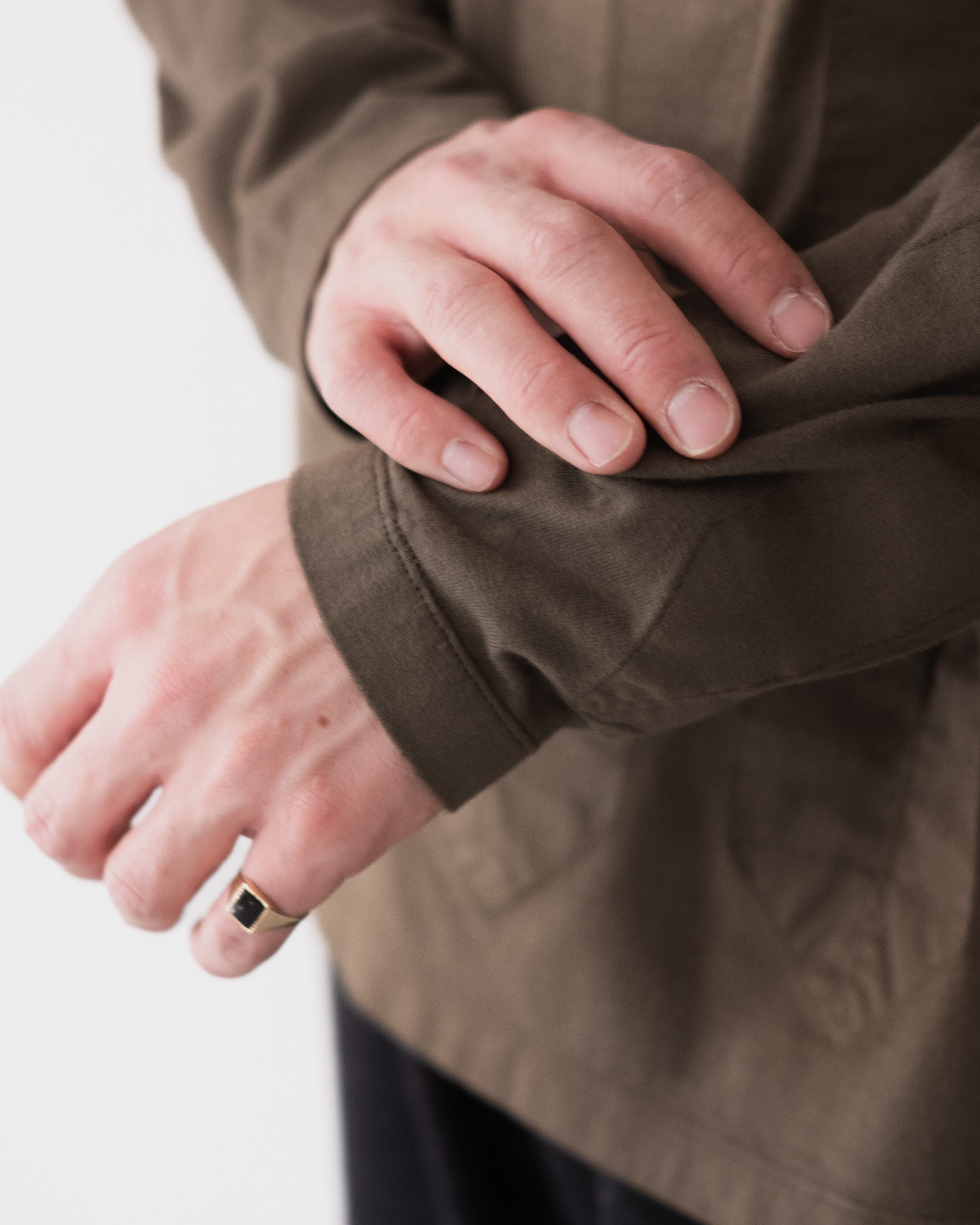 シルエットは程よく肩を落としたドロップショルダーに、ボディはゆったりとリラックス感を持たせながらも、着丈をコンパクトに抑えることでバランスを最適化。縦のラインが強調されたビジュアルと、落ち感のある生地の動きが、着る者の佇まいに安らかな存在感を与えてくれます。