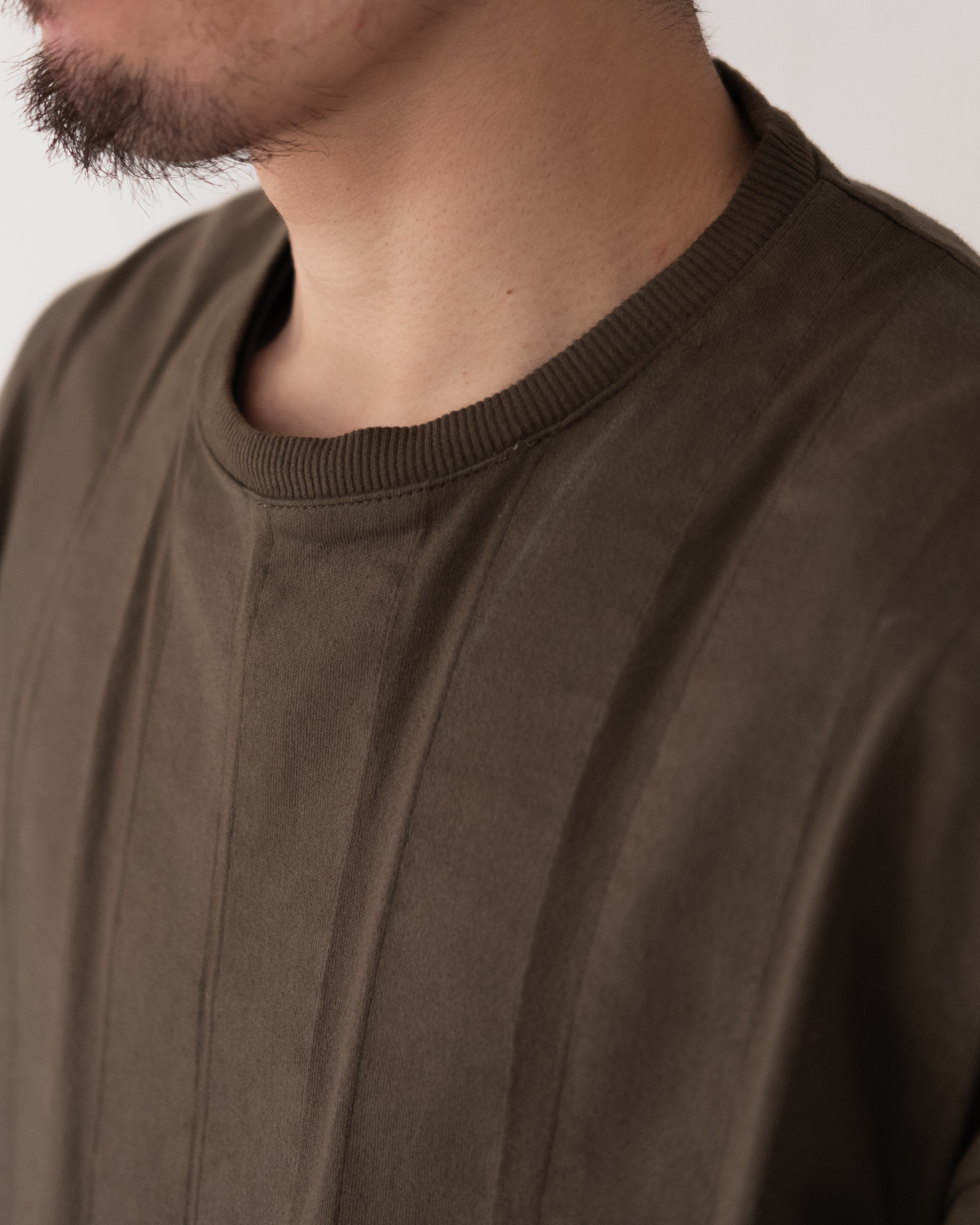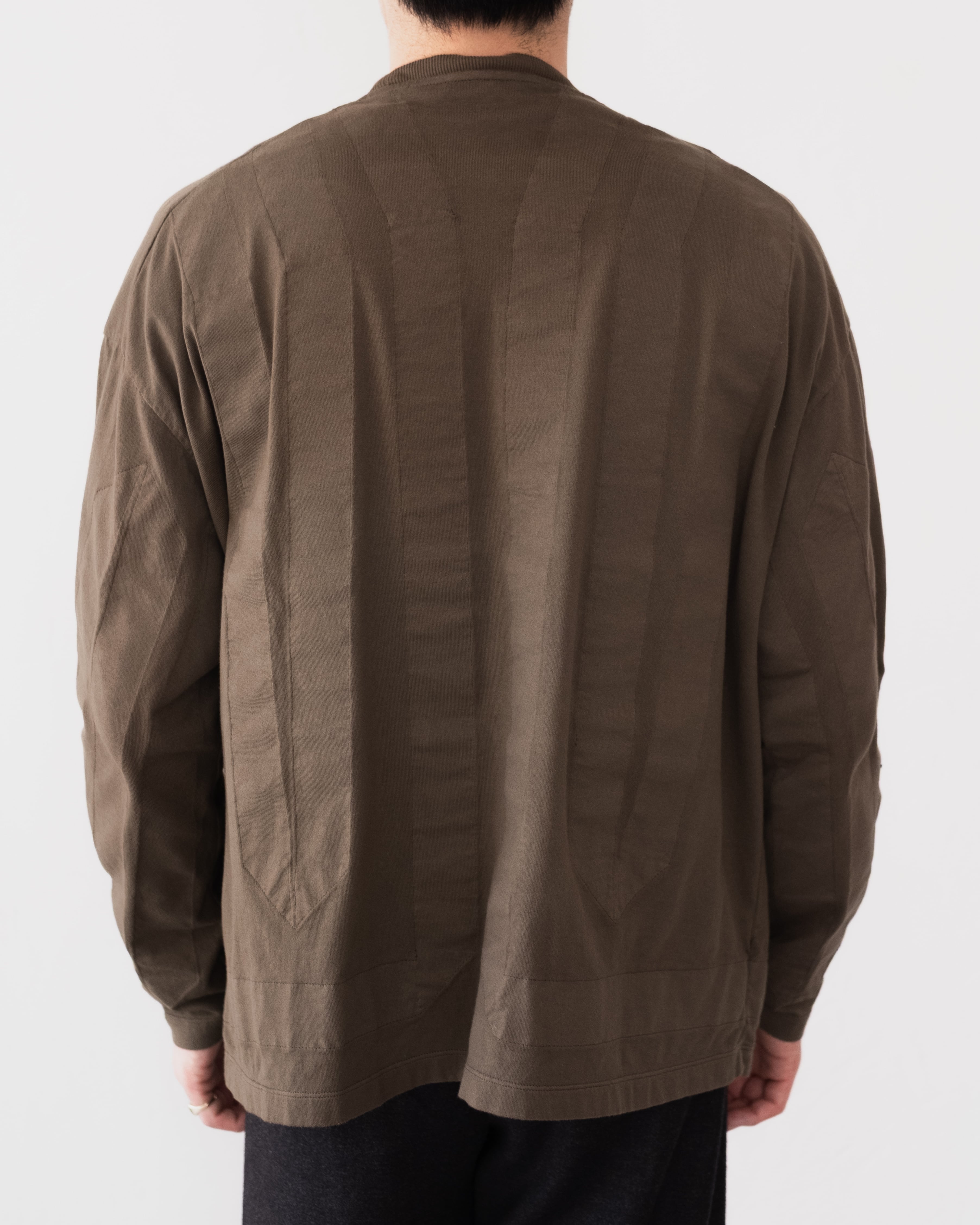 このカットソーの核心にあるのは、”視覚と触覚のズレ”。一見するとワントーンのミニマルなプルオーバー。しかし、その実、天竺編みの柔らかなコットンボディの内側には、コットンキャンバスの裏打ちが仕掛けられています。