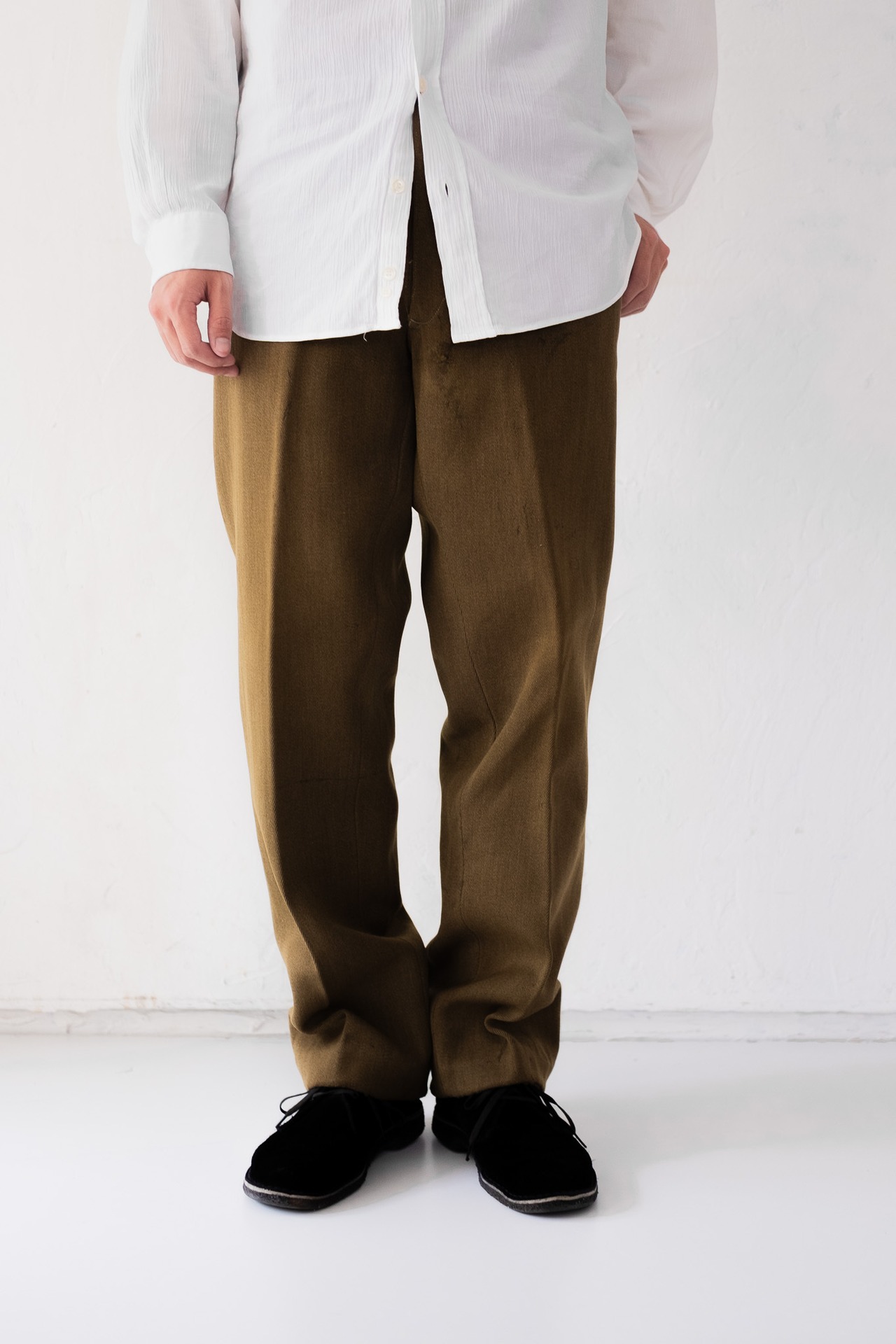 このディテールは英国軍服の中でも特に格式のあるパンツにしか見られない仕様であり、肌触りの良さと、脱いだときにも美しさを保つという設計思想が宿っています。