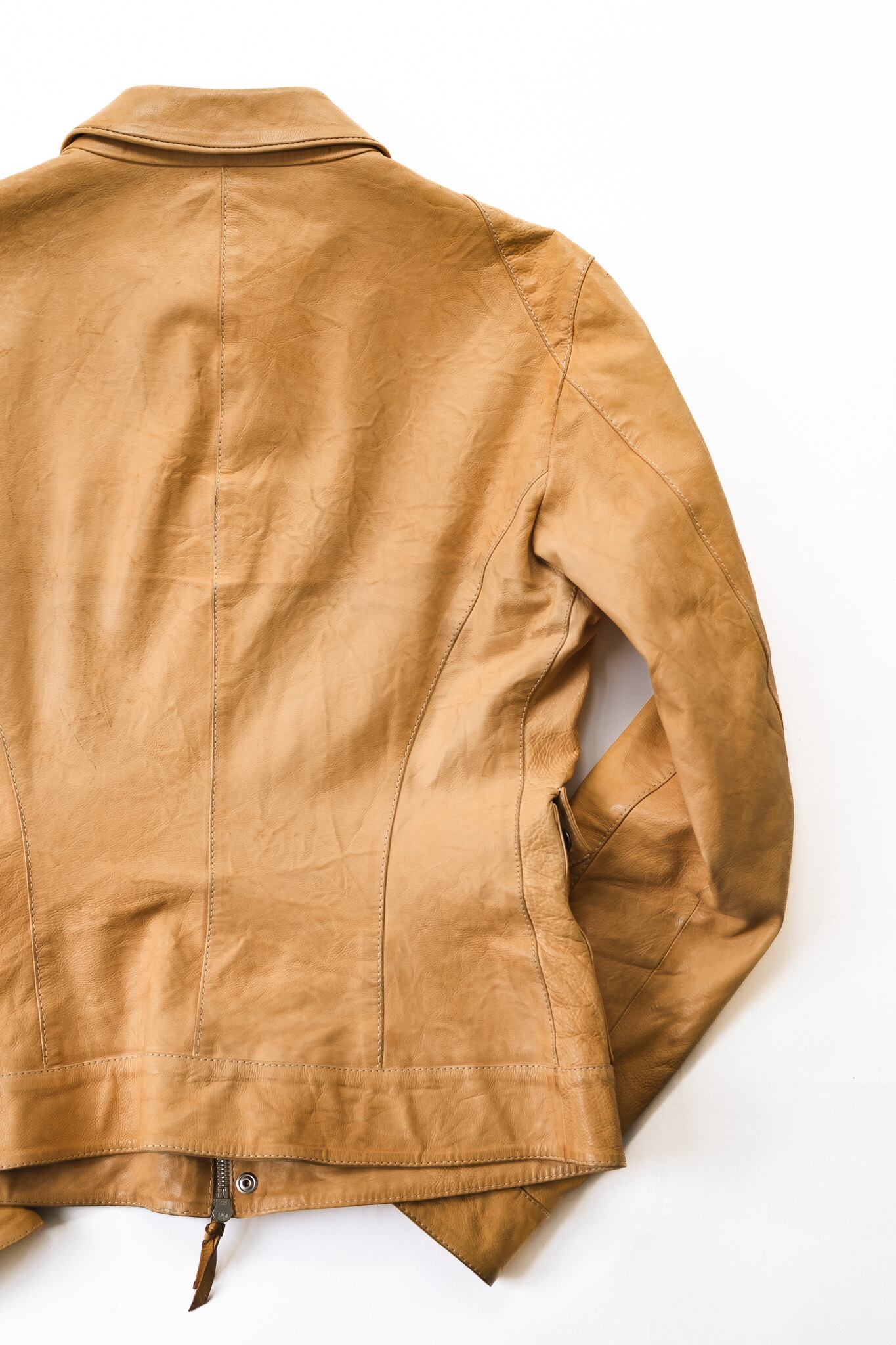 裏地全体には高密度で滑らかな生成りのコットンが使用されており、肌への当たりを和らげるだけでなく、レザーの内側に“呼吸する空間”を生み出しています。表地のレザーの緊張感と、内側のやさしさ。その対比もまた、ラフが仕掛けた美学のひとつです。