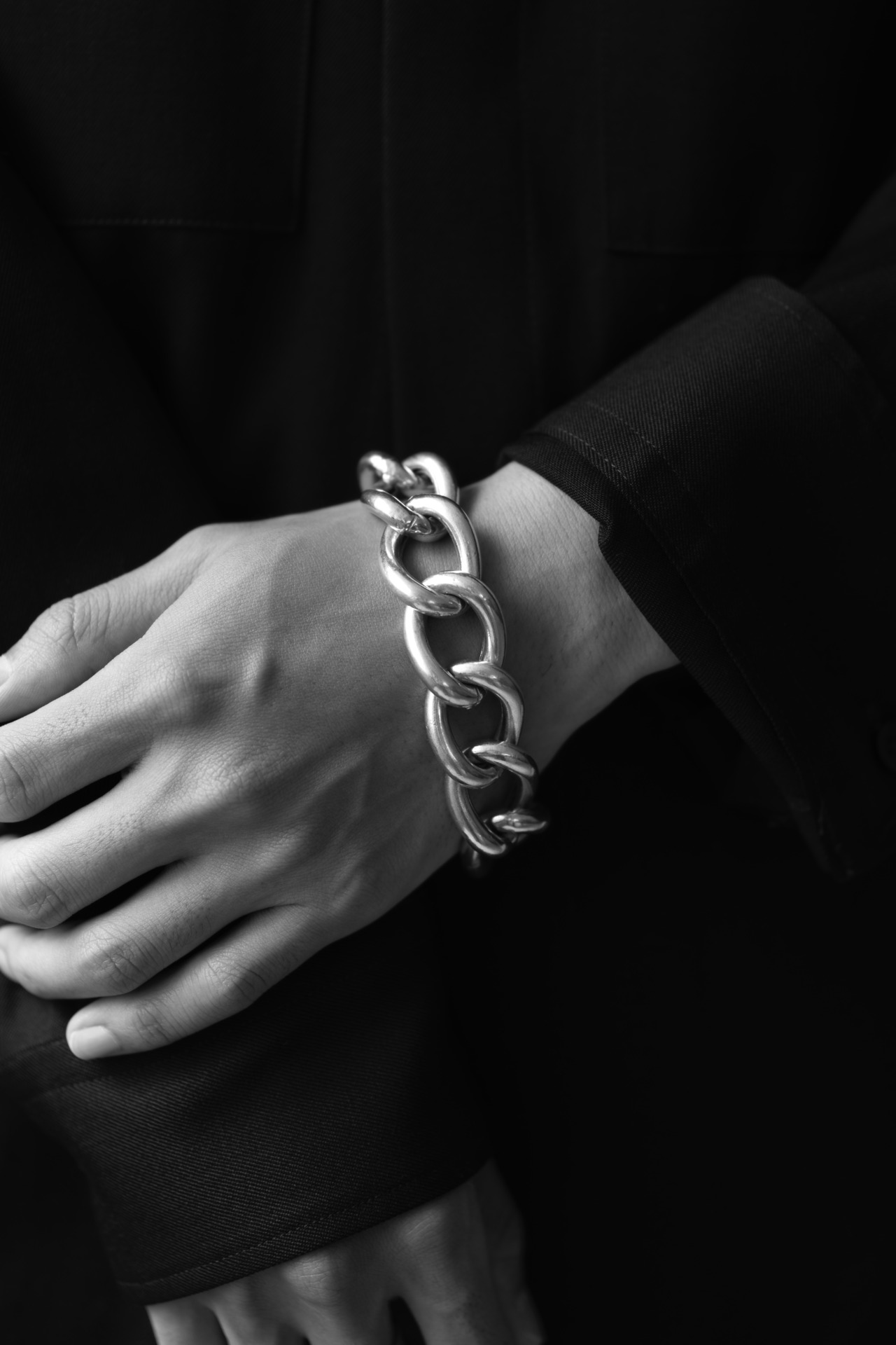 それは、もはや服を選ぶというより“装いに対峙する”という行為に近いかもしれません。Tシャツ1枚にこのブレスレットだけで成立してしまうほどの説得力。ジャケットの袖口から覗かせる場合は、むしろ主張しすぎない装いを選ぶことで、その重厚さが引き立ちます。