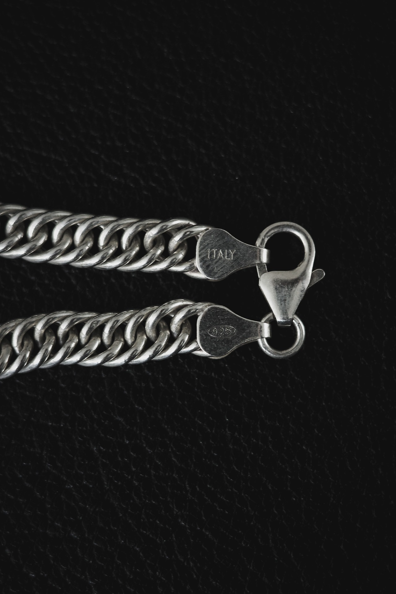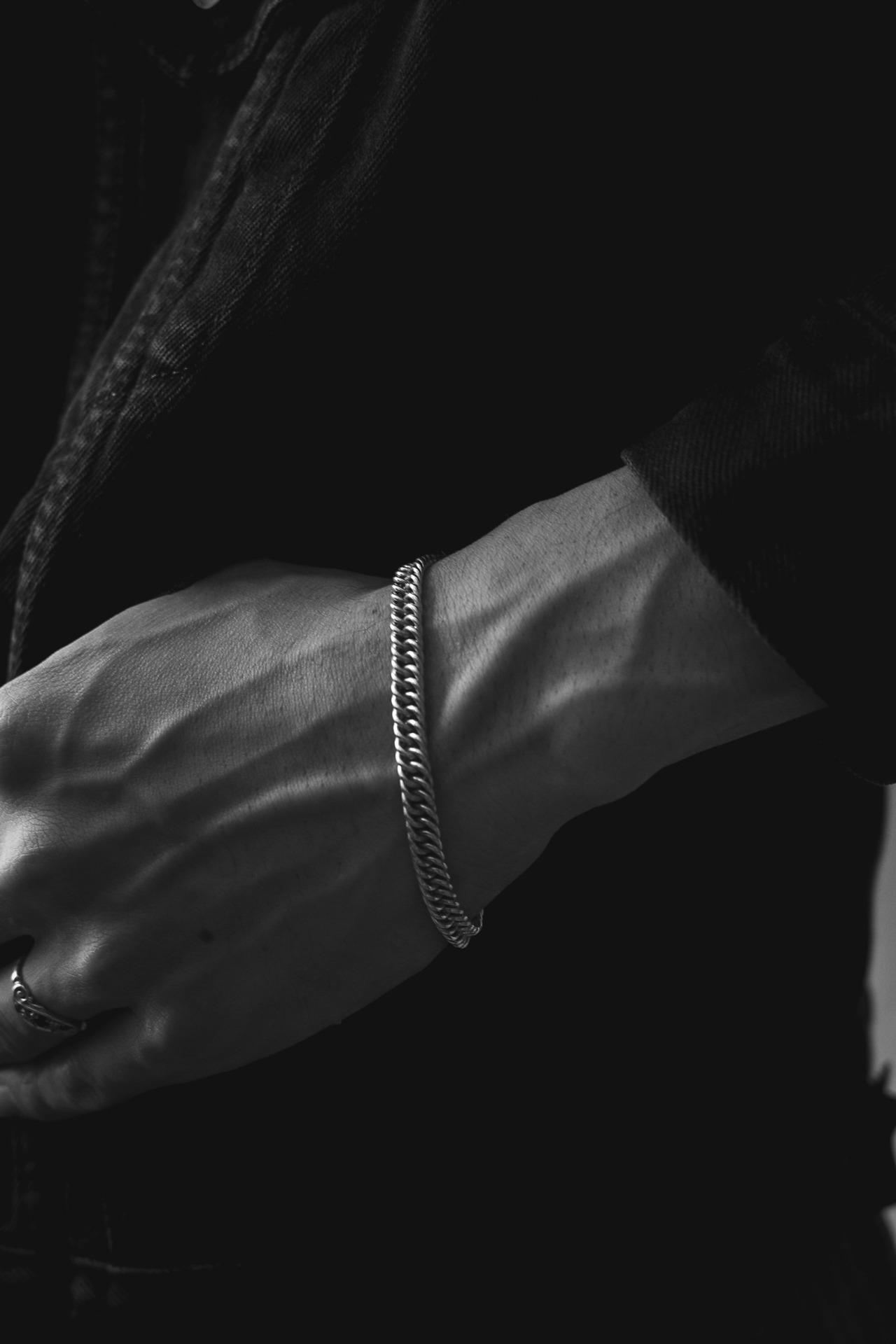 ご紹介するのは、イタリア製シルバー925によるフラットカーブチェーンのブレスレット。厚みを持たせつつも、リンクを極限まで密に繋げたその構成からは、どこか“静かな迫力”のようなものが感じられます。