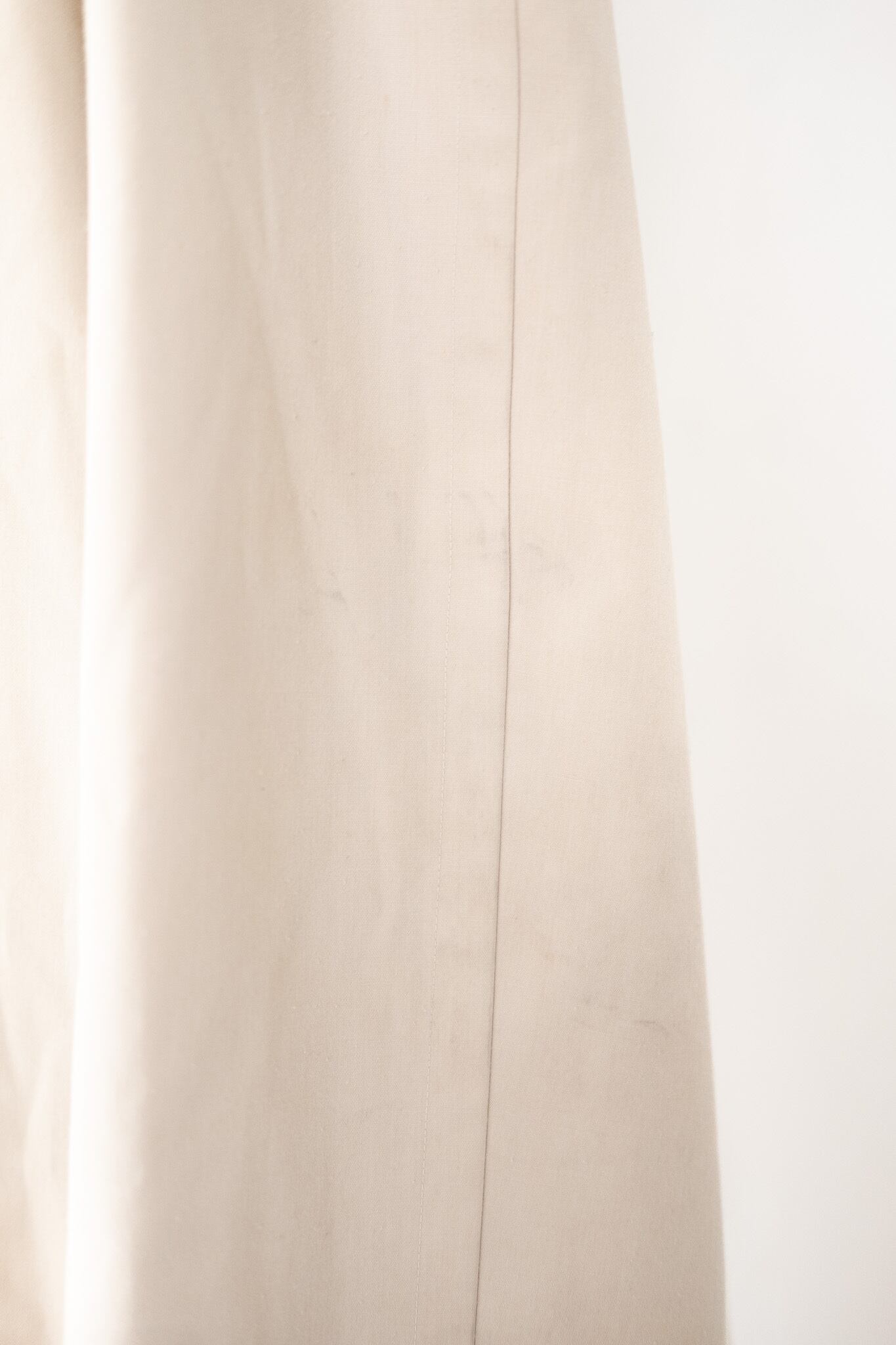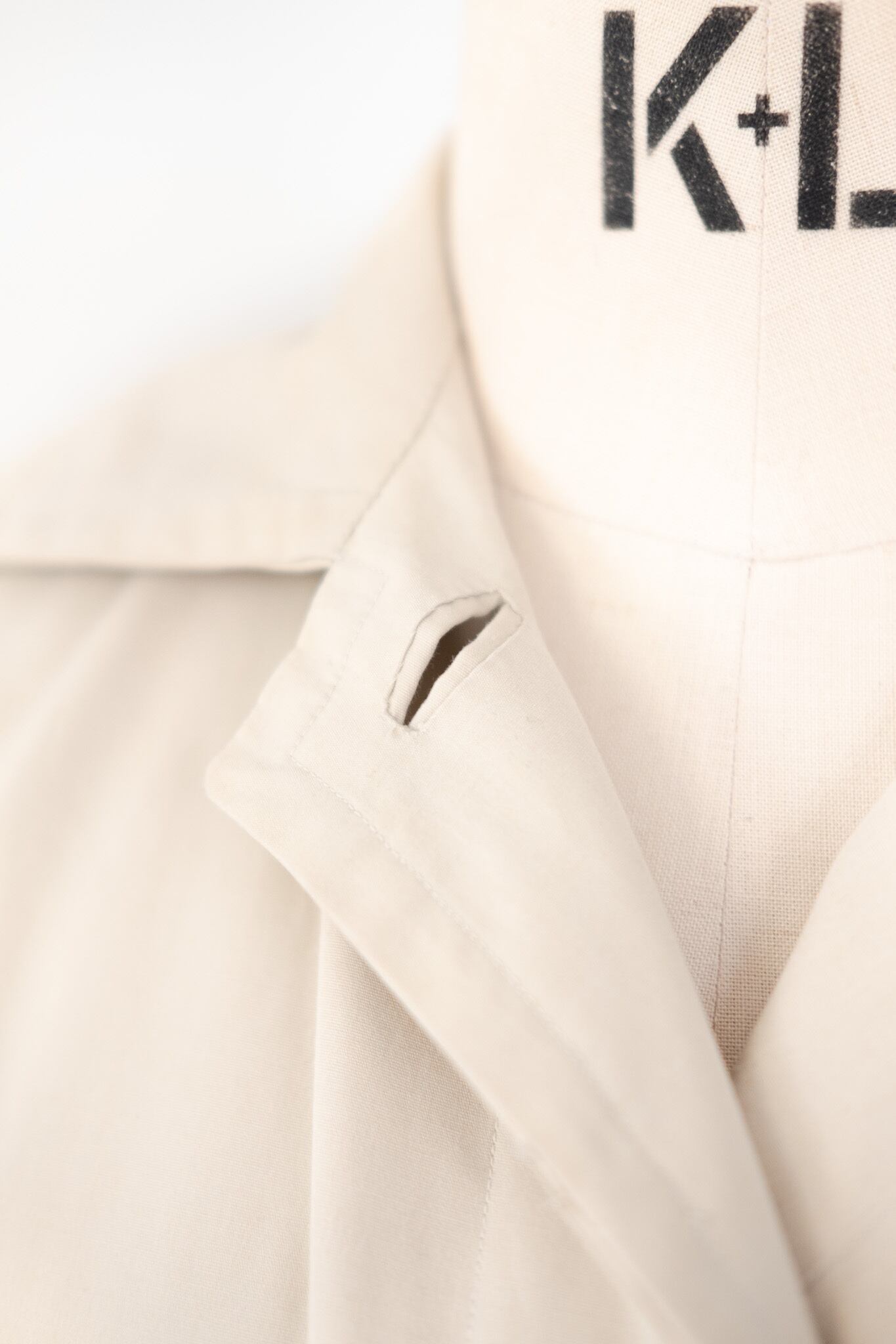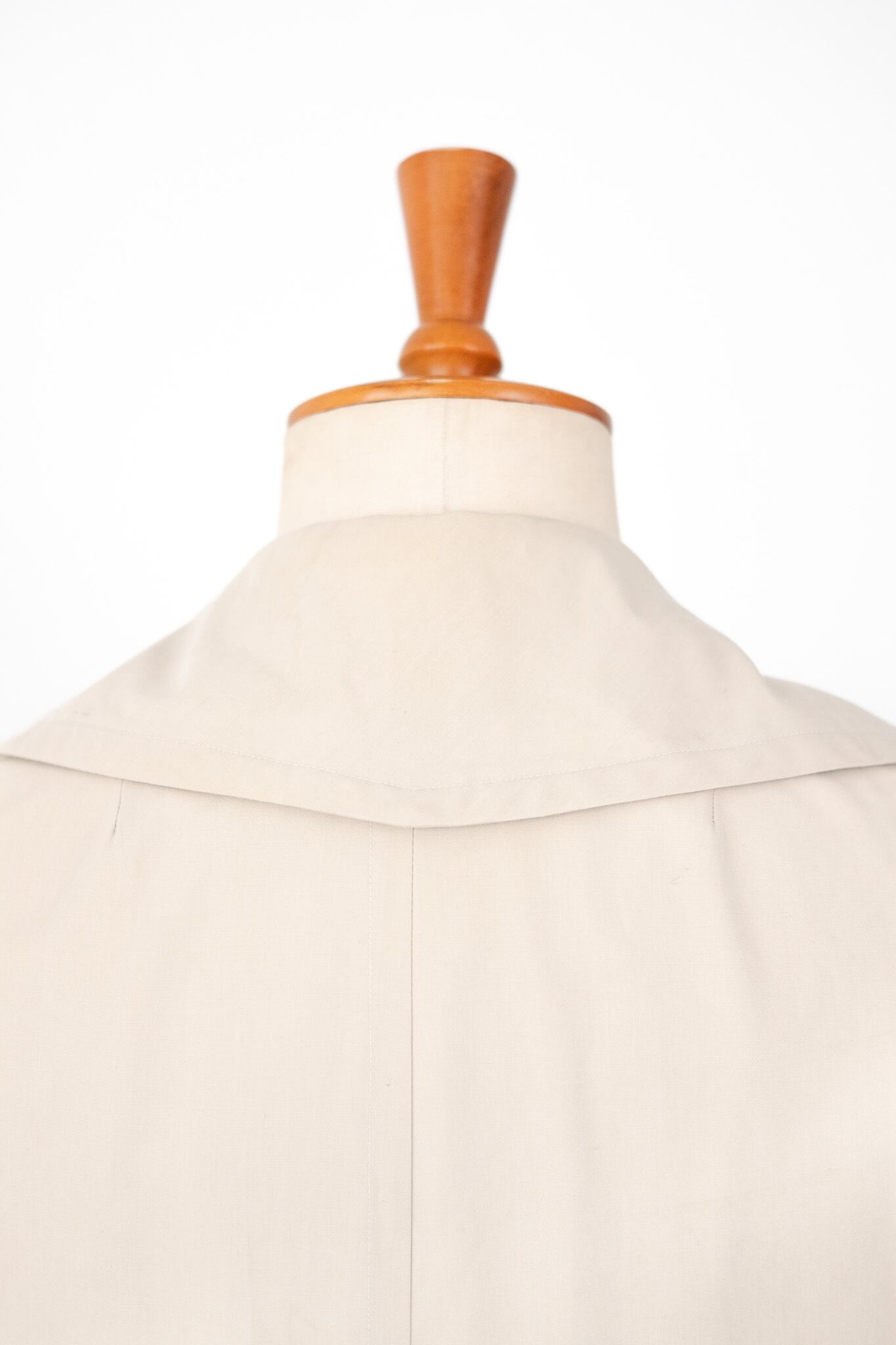 生地は高密度のコットンギャバジン。撥水性を備えながら、英国製のものよりもやや柔らかく、仏仕立てならではのしなやかな落ち感を持ちます。色味はサンドベージュに近い中間色。静けさの中に輪郭を浮かび上がらせる、非常に奥行きのあるトーンです。