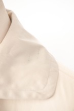 襟は一見バルカラー型でありながら、実際にはラペルのように大きく広がる独特のカッティングを持ち、外周にはダブルステッチの装飾。裏側には別布切替が走り、ハンティングウェアの機能美とテーラードの構築性を兼ね備えています。もはや「ステンカラーコート」と一言で括るには収まりきらない、逸脱の美学がそこにあります。