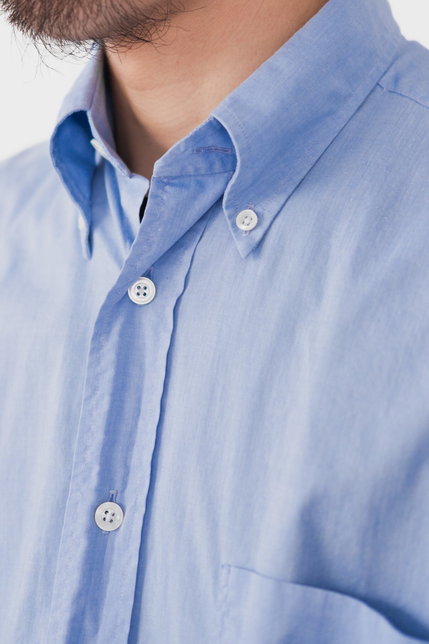 ボタンダウンの襟はロール感が美しく、第一ボタンを外しても、タイドアップしてもサマになる絶妙な設計。胸ポケットがひとつ配されたスタンダードな構成ながら、ディテールや縫製の精度の高さが、このシャツを単なる“ベーシック”では終わらせません。