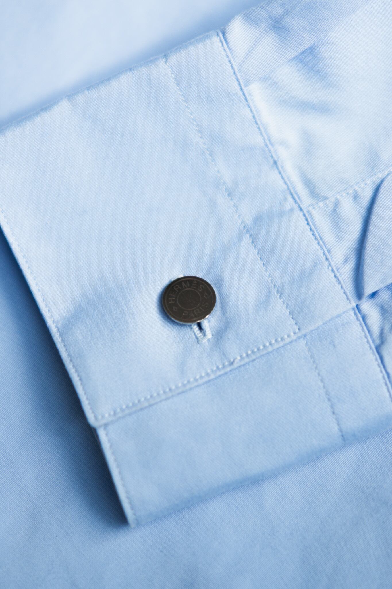 そして袖口に配されたのが、HERMÈSを象徴するセリエボタン。メタル製のこのディテールは、馬具製造にルーツを持つ同メゾンならではの“機能美”の結晶とも言えるもの。カフリンクスのように存在感を示しながら、過剰にならない絶妙なバランスでシャツの格を引き上げています。