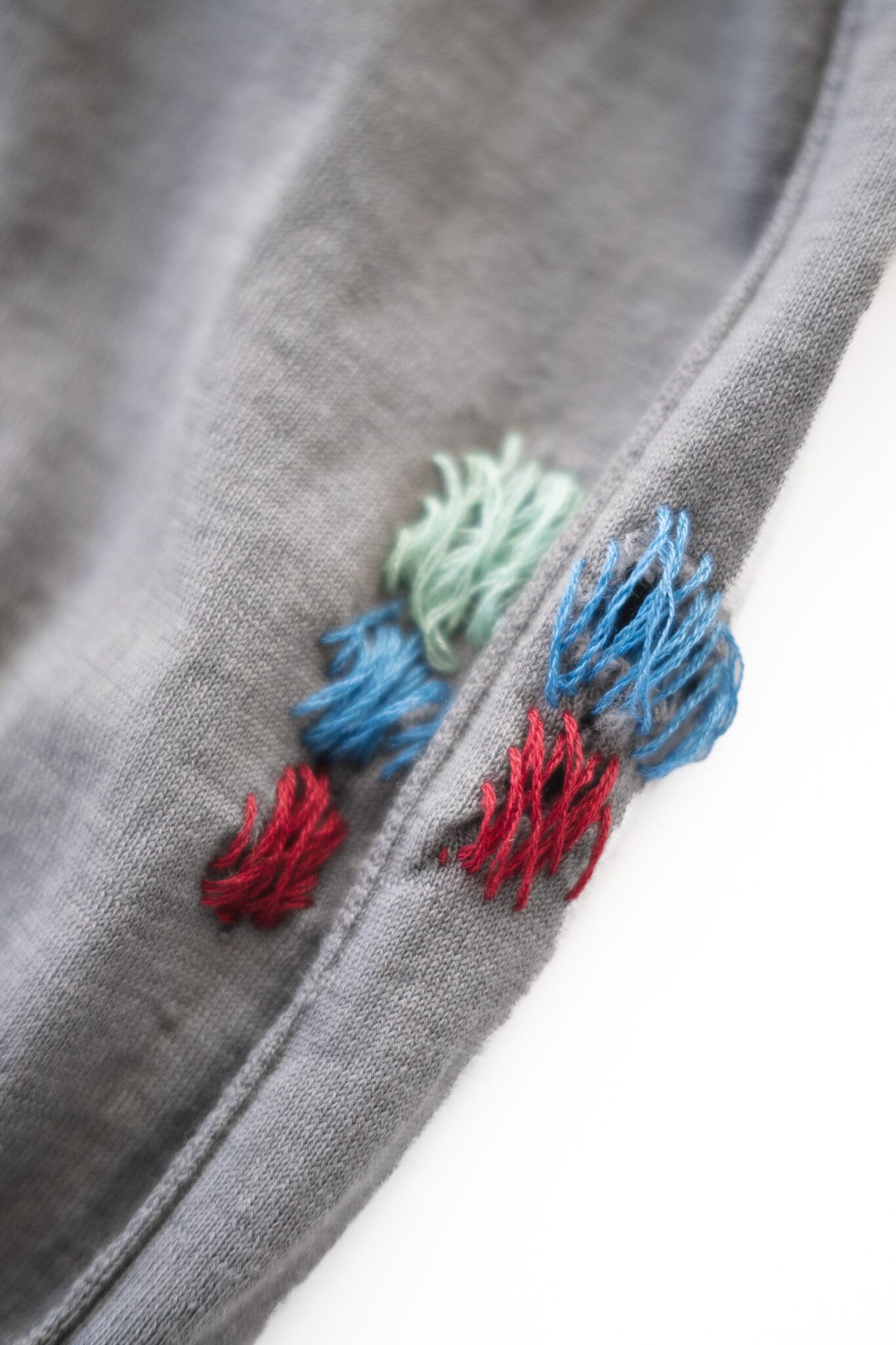 敢えてカーディガンに穴を開け、赤や青といった鮮やかな糸で塞ぐ。
