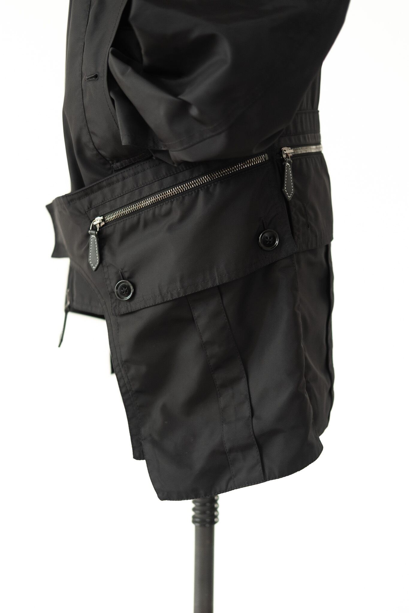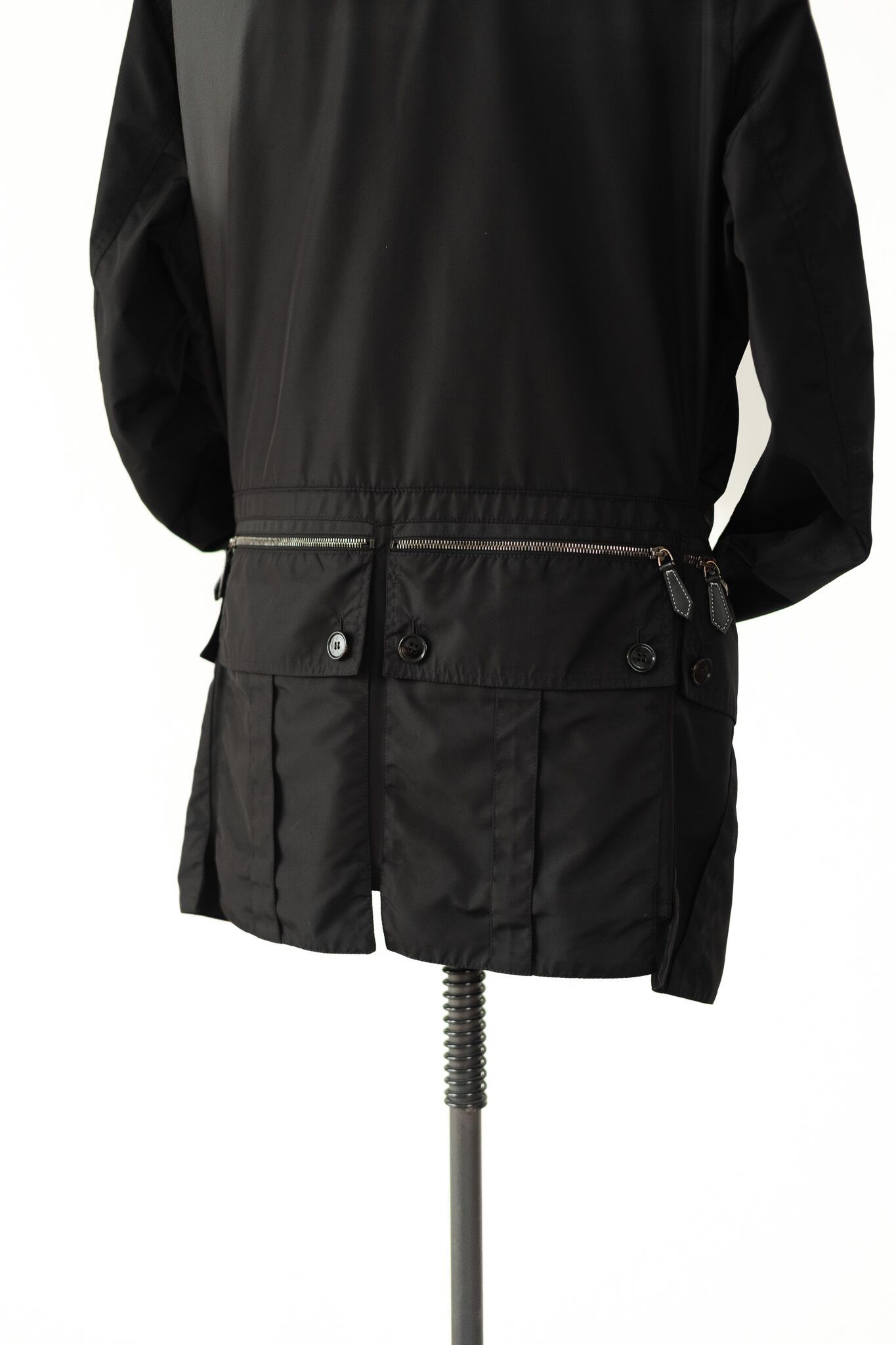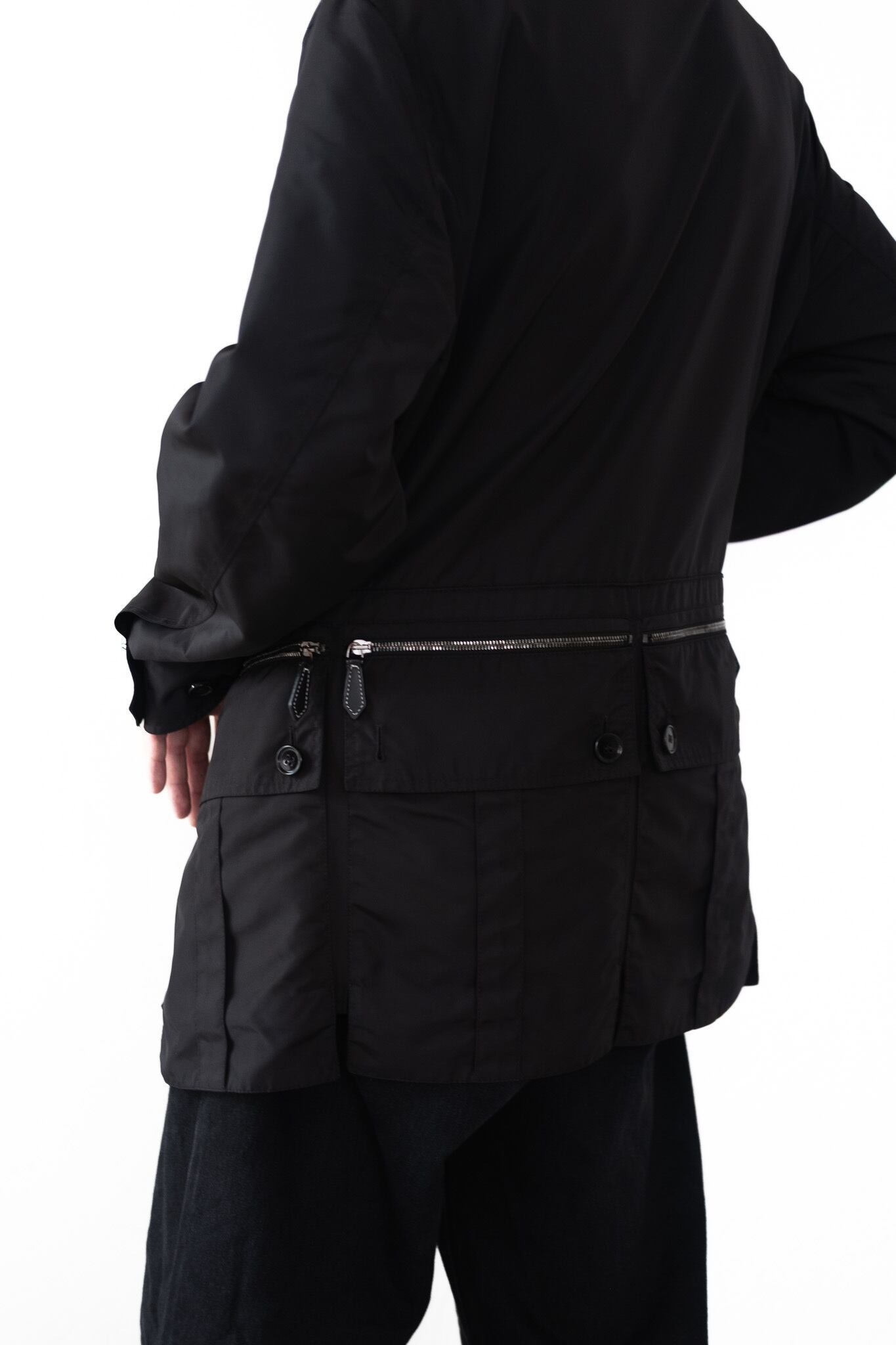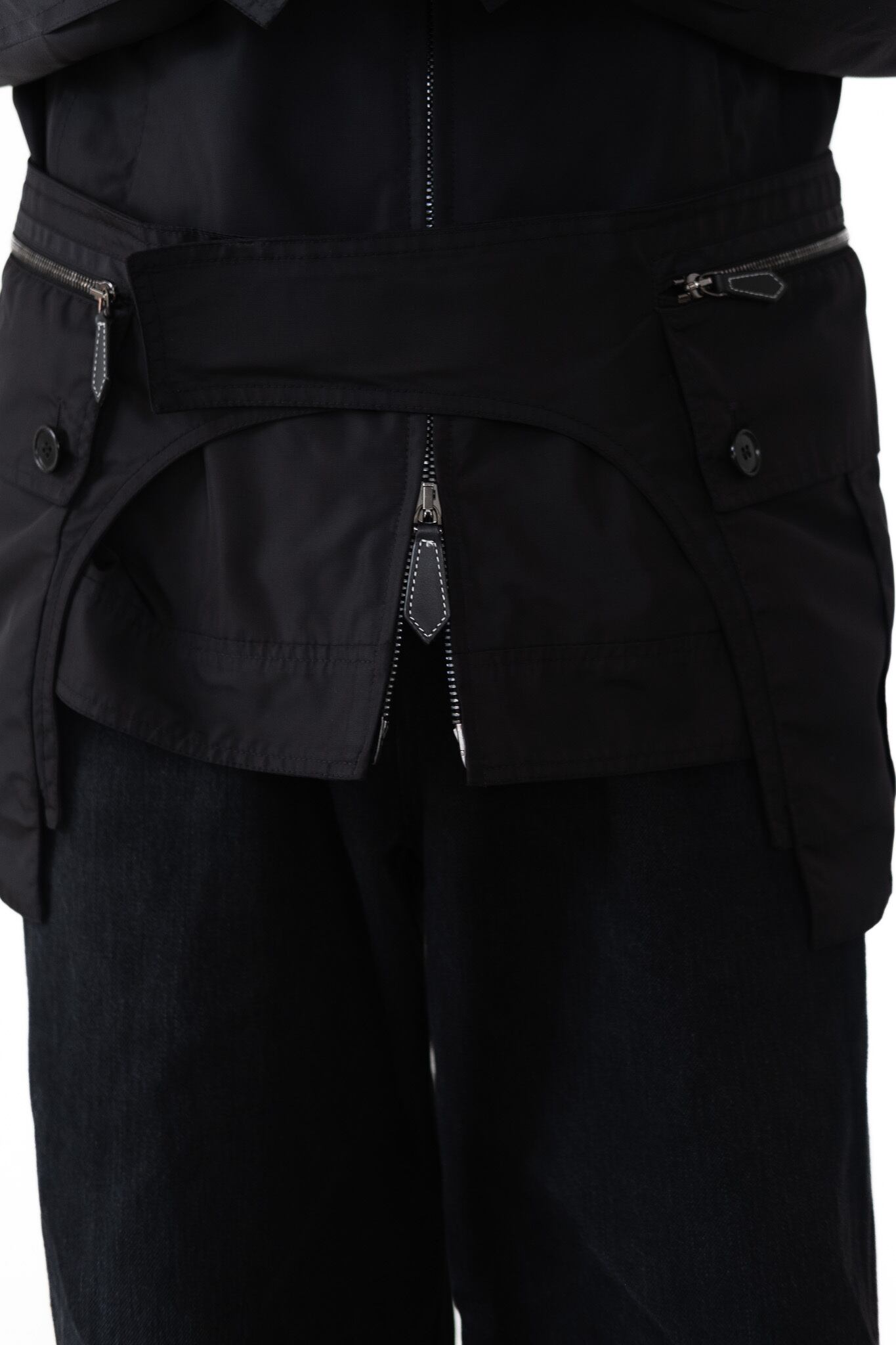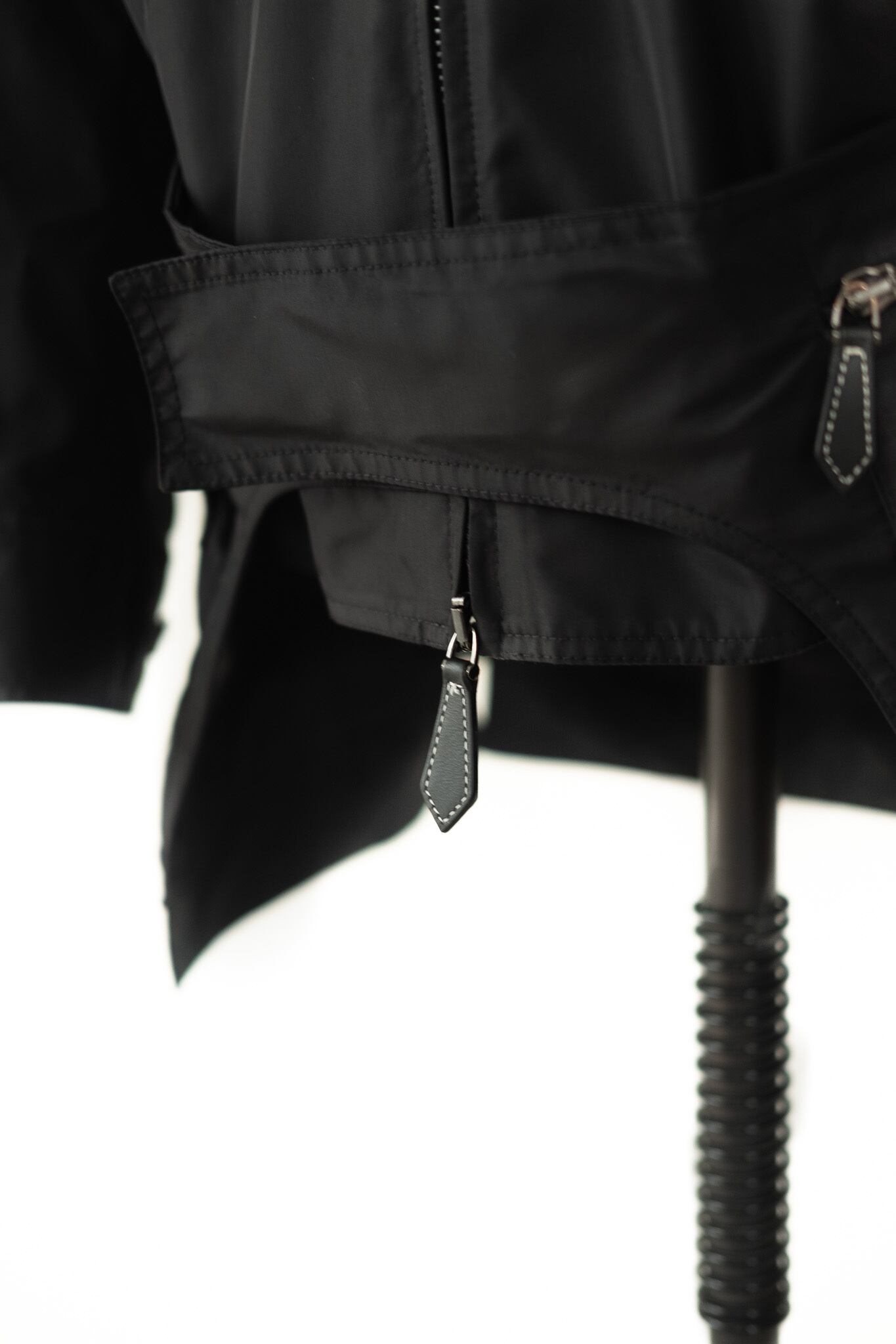一見するとミニマルなブラックナイロンジャケット。しかし、ウエスト周りに大胆に配置されたディテールがただものではありません。