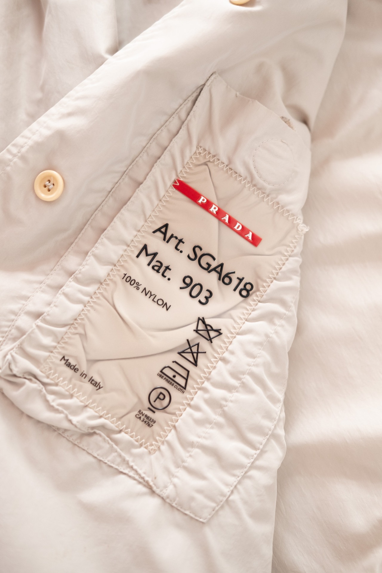 内側にはPRADA定番のネームタグと品質表記パッチを備え、ブランドの哲学がジャケットの内面にまで染み込んでいることを感じさせます。
