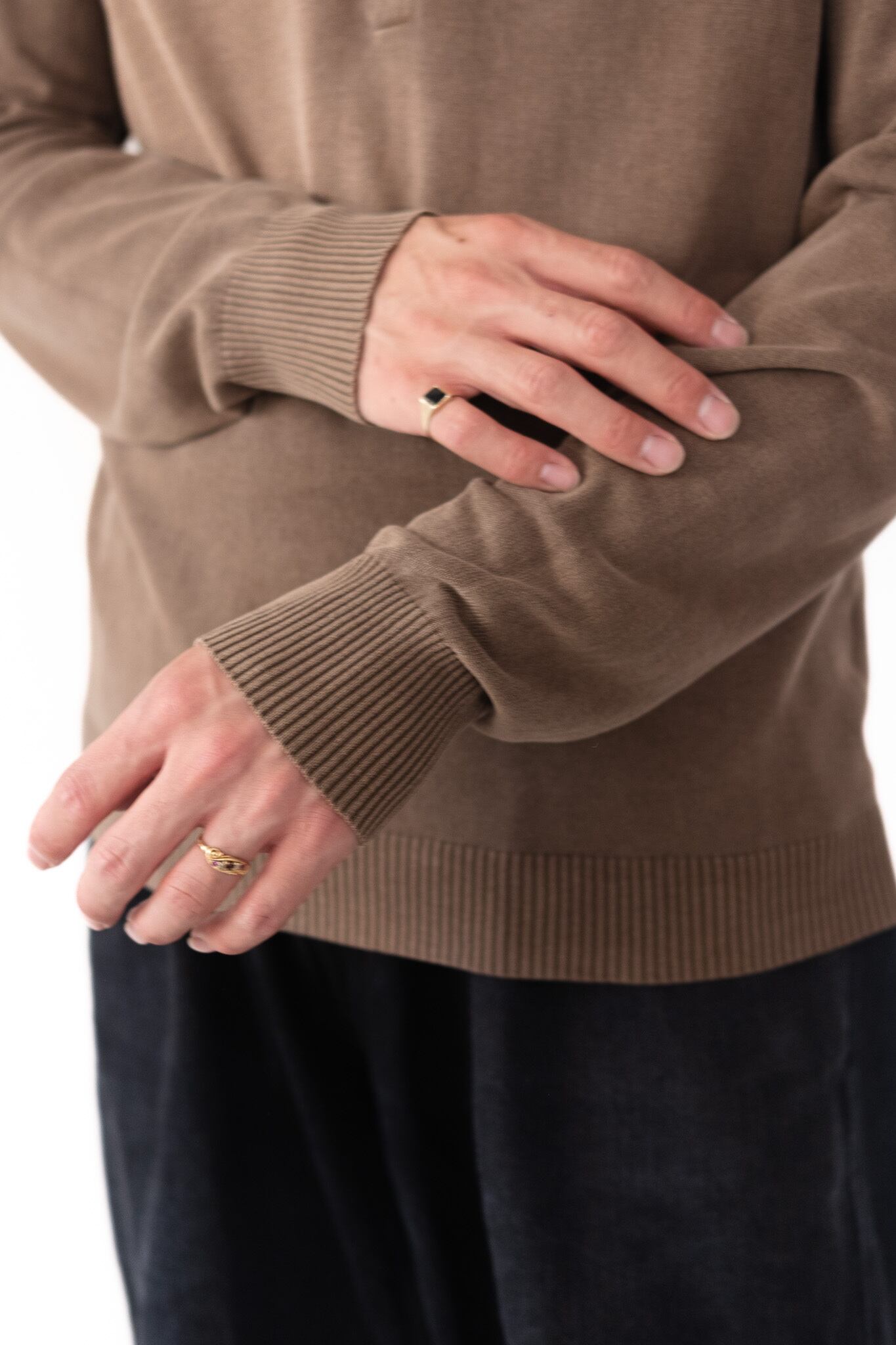 最大の特徴は、縫製後に製品を丸ごと染め上げる「ガーメントダイ(製品染め)」の技法。縫い目やボタン周辺、リブといったパーツごとに微細な濃淡が生まれ、ニュアンス豊かな表情を形成しています。色味はモカブラウン系ですが、単一トーンではなく、角度や光によって褪せたような奥行きを見せてくれます。
