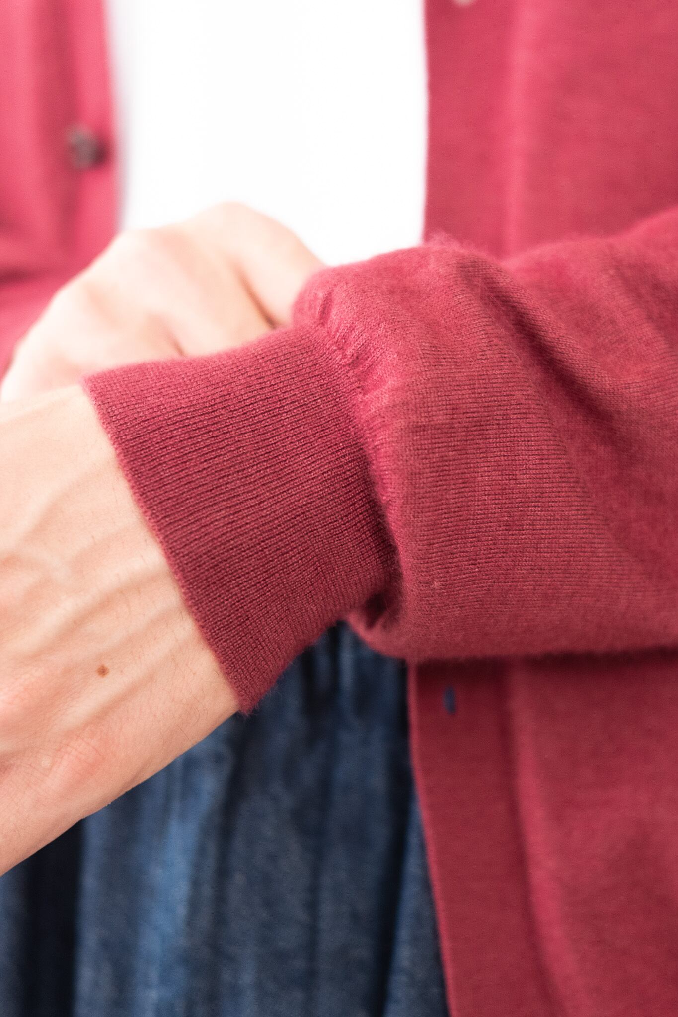 シルエットは、身幅にゆとりを持たせつつ、裾のリブで適度に収まりをつけたバランス感覚。丸みを帯びた袖とたっぷりとしたアームホールが、クラシックなムードを纏いつつも現代的なニュアンスを加えています。ジャケットのインナーとしても、素肌にさらっと羽織っても成立するのは、この絶妙な寸法設定のなせる業でしょう。