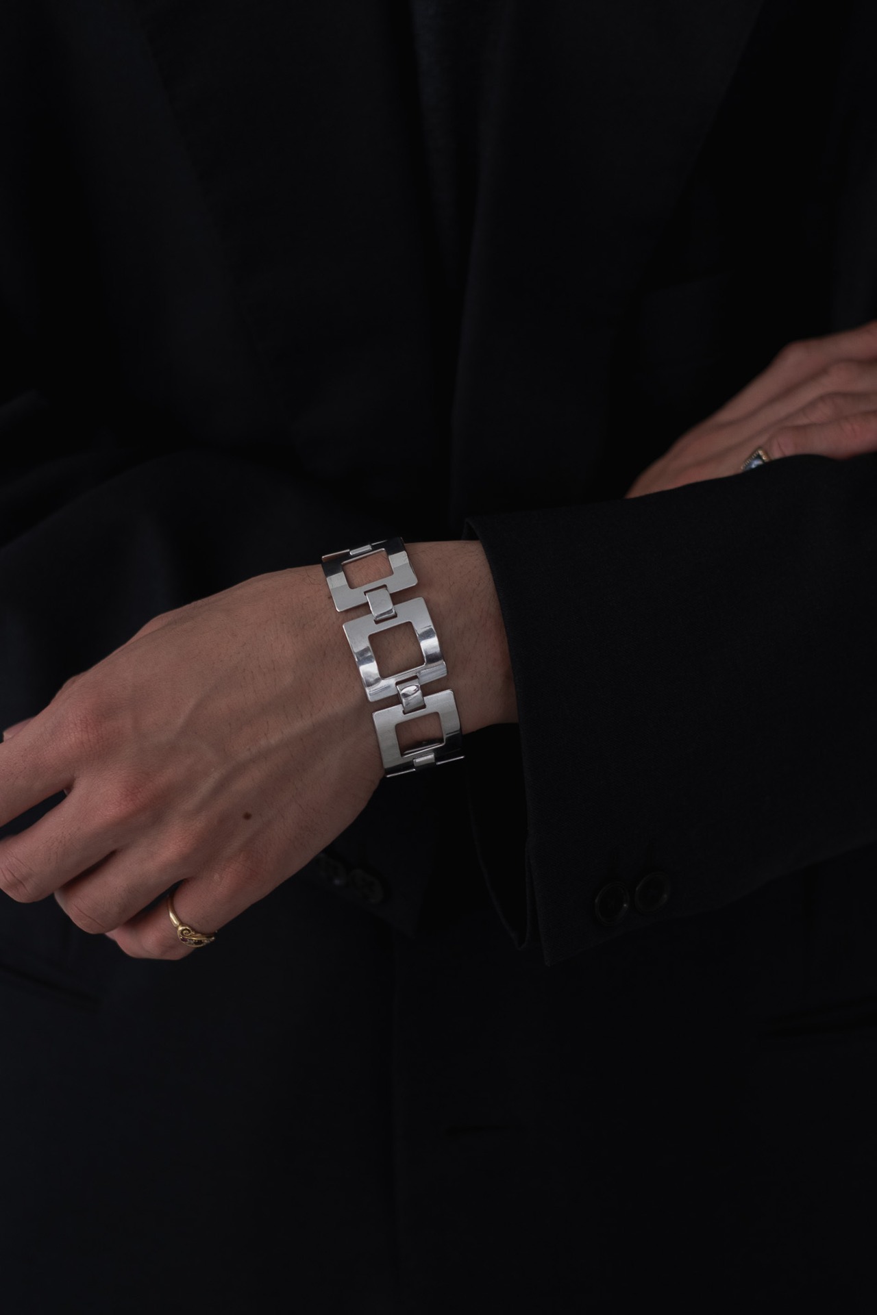 このブレスレットは、六つのスクエアパーツが連なって構成されています。一つひとつのパーツは、中央を大胆に抜いた中空構造。その潔い幾何学形状が、まるで建築のファサードのように静かに連なり、視覚的なリズムを生み出しています。