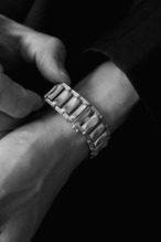 留め具の構造も印象的です。先端を差し込み、上部からロックパーツをパチンと倒す二段階仕様。さらにセーフティーチェーンを引っかけることで脱落を防ぎます。機械的に完成されたこの構造には、単なる装飾品の枠を超えた信頼感があります。見えない部分にこそ宿る美意識。それがこのブレスレットの静かな説得力につながっています。