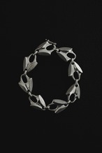 ひとつひとつのリンクは、葉のように湾曲した輪郭と、中央に配された空洞によって、軽やかさと構造的な強さを同時に備えています。表面は鏡面仕上げで艶やかに磨かれ、サイドには控えめなマット加工が施されることで、光を受けた際に豊かな陰影が生まれ、動きとともに表情を変えていきます。そのたびに、まるで小さな彫刻を連ねているかのような錯覚を覚えることでしょう。