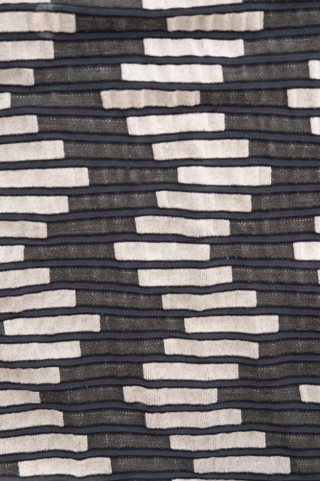 最大の特徴は、そのテキスタイルにあります。黒とグレージュのボーダーをベースに、不規則な横長のピクセルのような編地が整然と並び、まるでモアレや波紋のような視覚効果をもたらします。直線的でありながら流動的。規則と逸脱が同居するデザインは、無地のような落ち着きと、模様としての強さを両立しています。