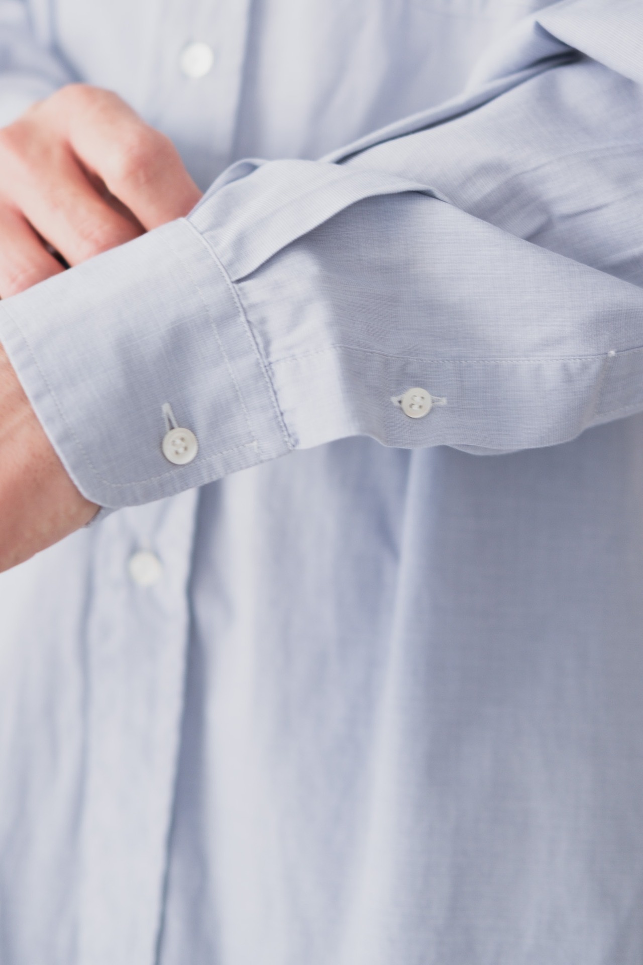 襟はミニマルなレギュラーカラーで、ジャケットの下に合わせても、シャツ1枚でも美しく映える設計。袖口は2ボタンのプレーンカフで、剣ボロの形状も直線的かつ端正にまとめられています。