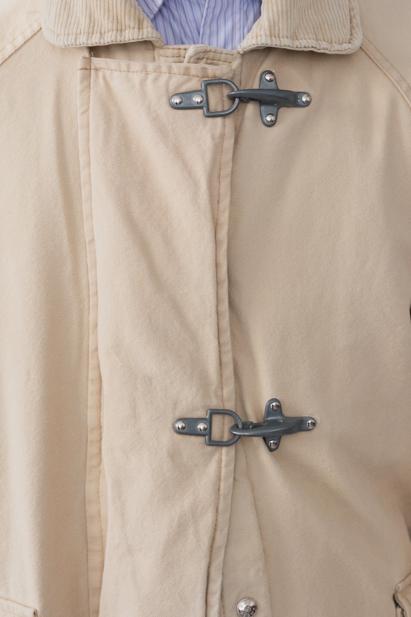 フロントには、金属製のファイヤーマントグルを3点配しており、インダストリアルな佇まいを演出しております。このフックディテールは実用性というよりも、意匠としての存在感を強く打ち出しており、90年代のイタリアンワークウェアにおける“機能性の装飾化”をよく表しています。