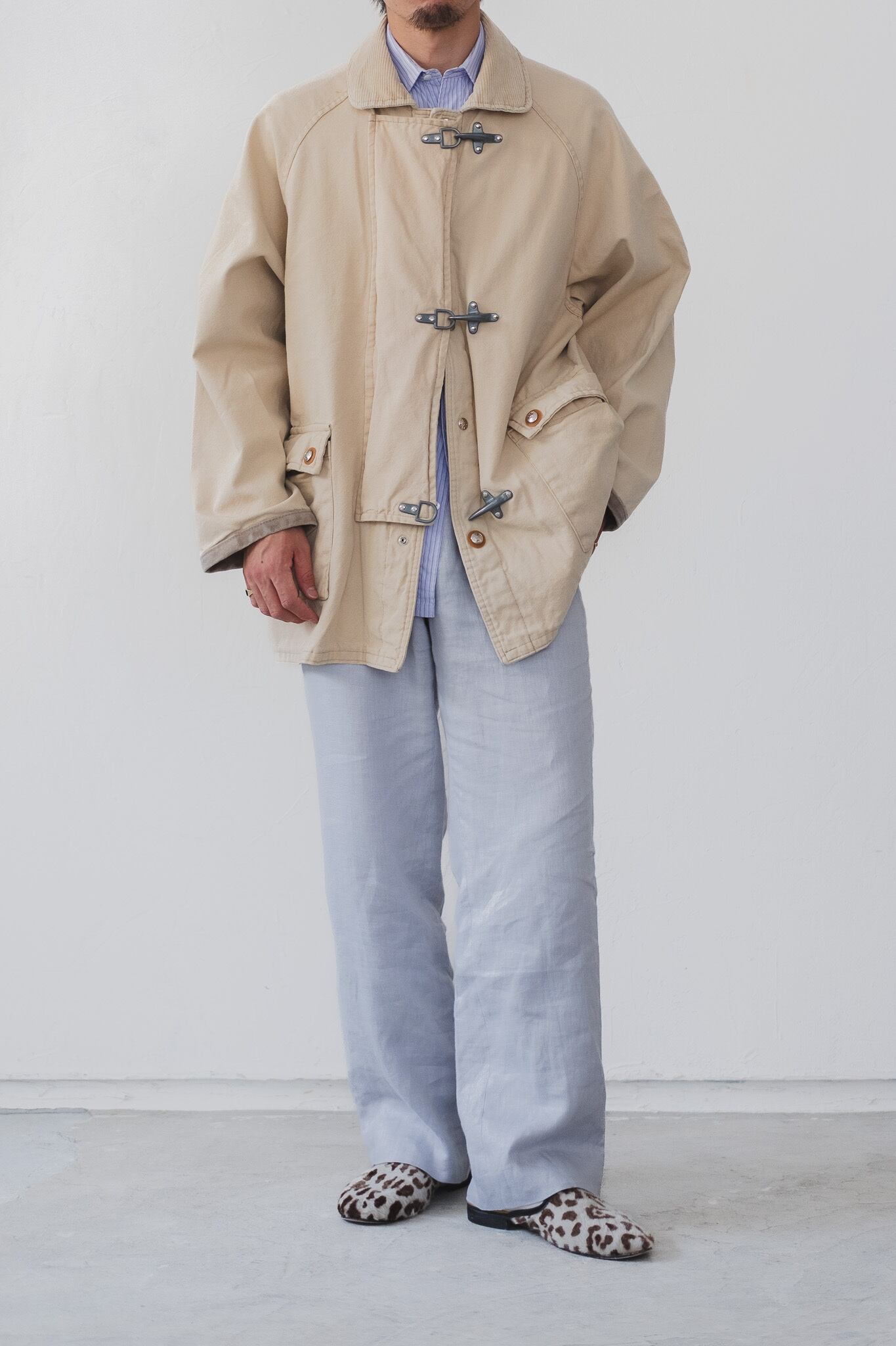 シルエットは全体的にゆとりのあるAラインで設計されており、裾にかけて自然に広がるラインが、着る人の動きと調和いたします。ファイヤーマンジャケット由来の重厚な金具や、大ぶりのポケットなど、直線的で機能的なディテールが並ぶ中で、どこか柔らかさと親しみを感じさせるバランス感が魅力です。