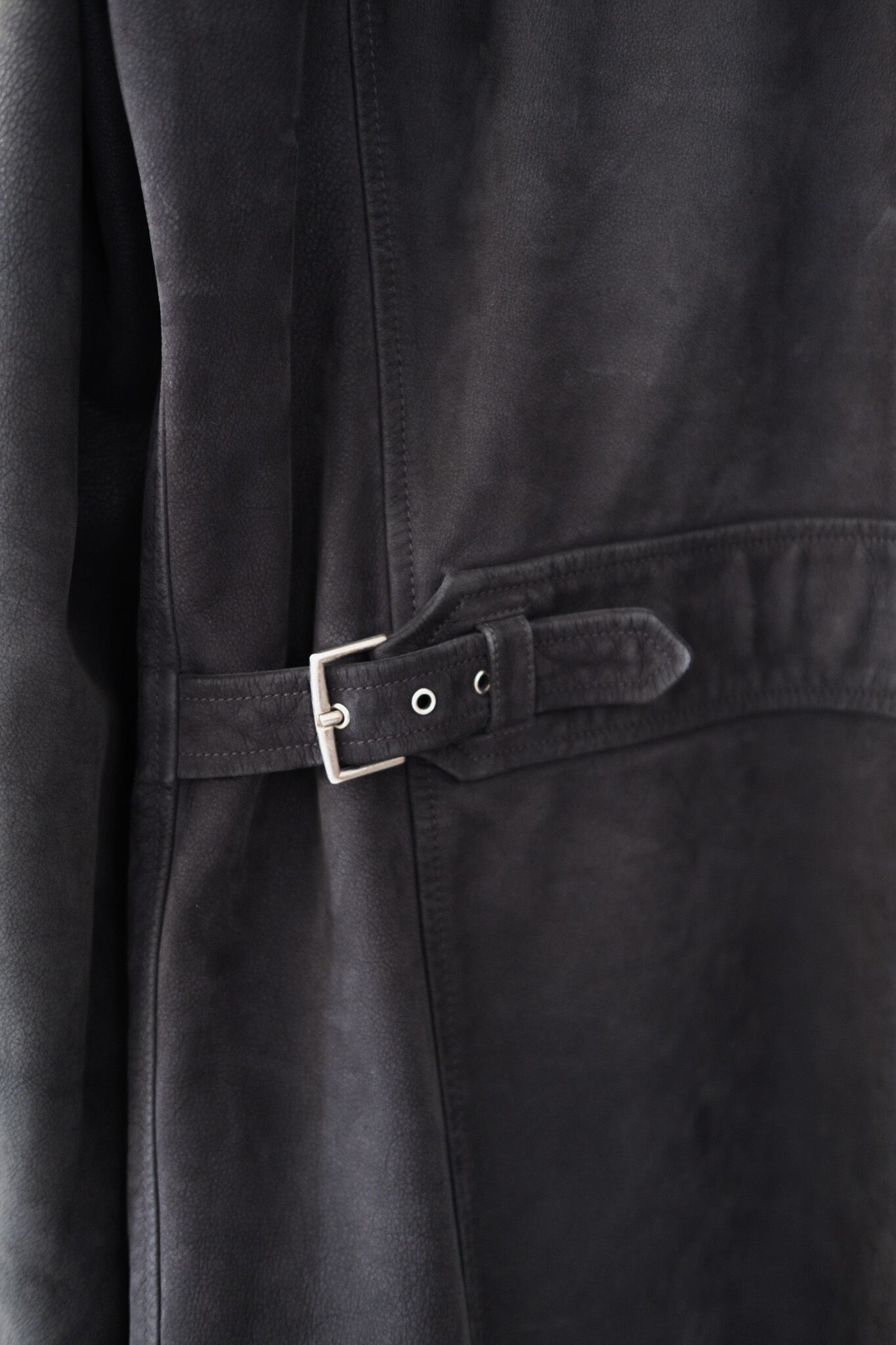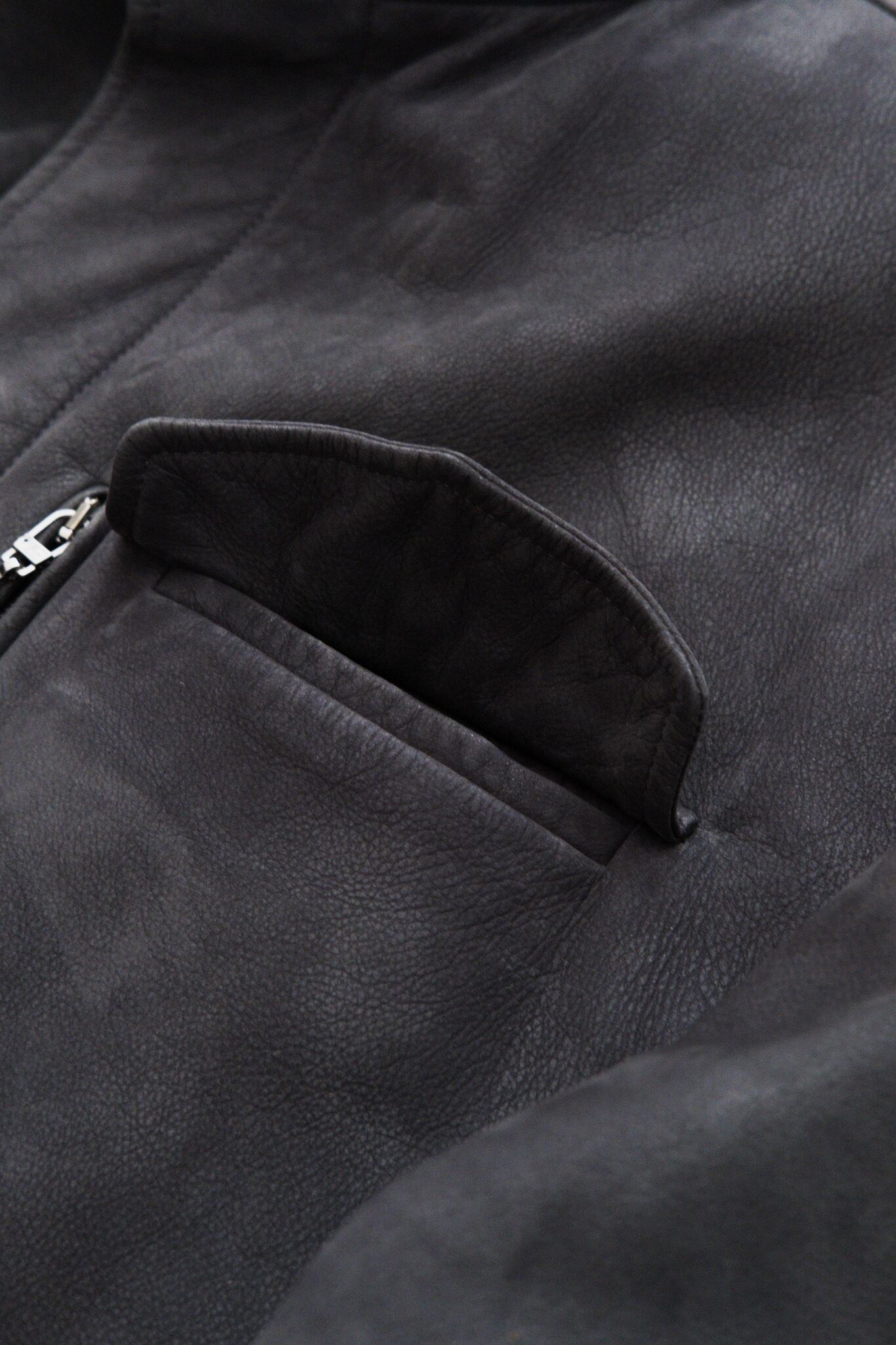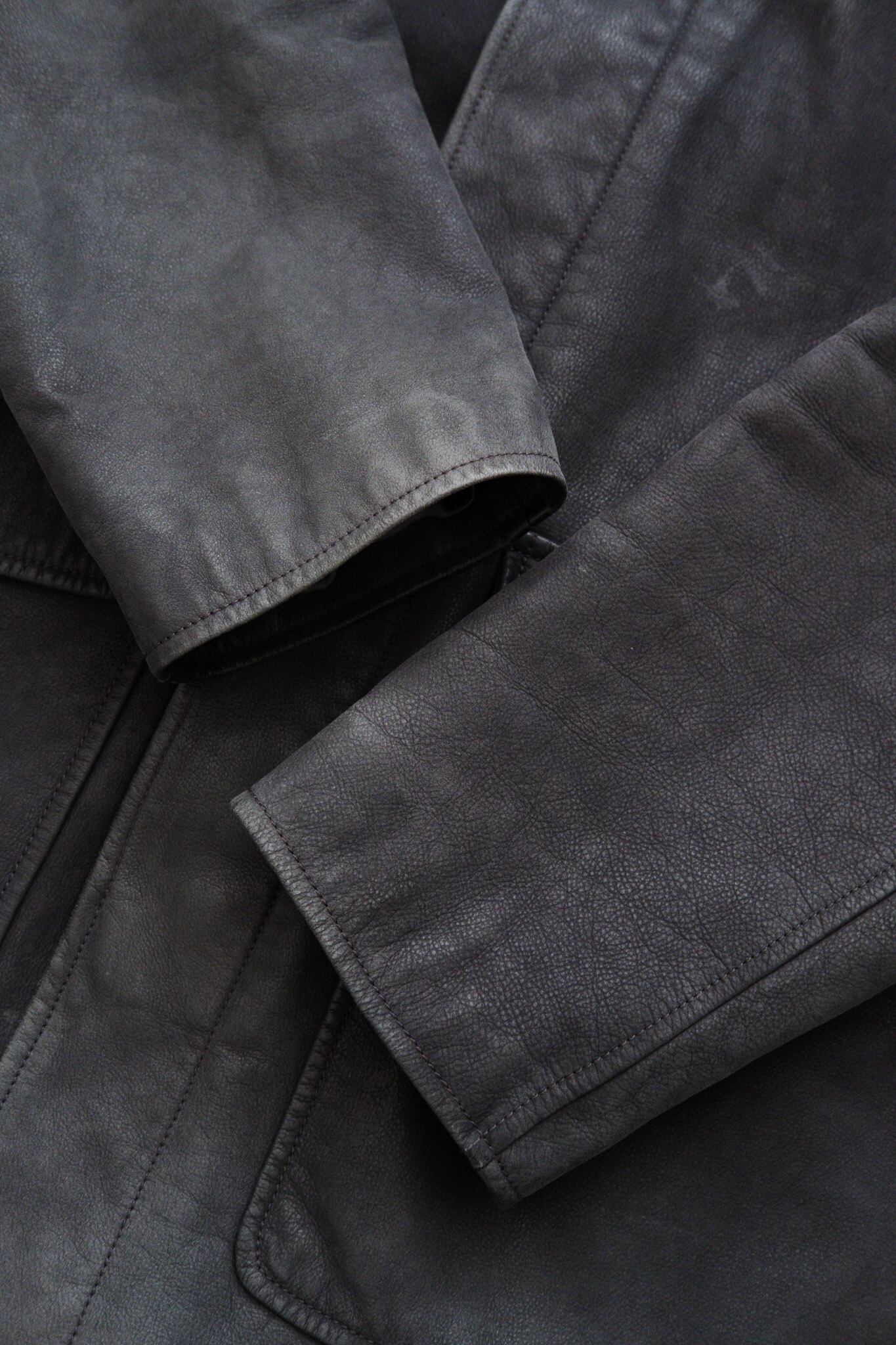 素材には、粒の大きいグレインを持つ高密度のバッファローレザー(水牛革)を使用。表面はスウェード調のマットな仕上げが施され、革でありながら光沢を抑えた柔らかい質感に。手に取ればずっしりと重厚な感触がありながら、着ると重さを感じさせないバランス感も見事です。しっとりとしたタッチと、時間をかけて育つ革の奥行き。その両方を持ち合わせた素材です。