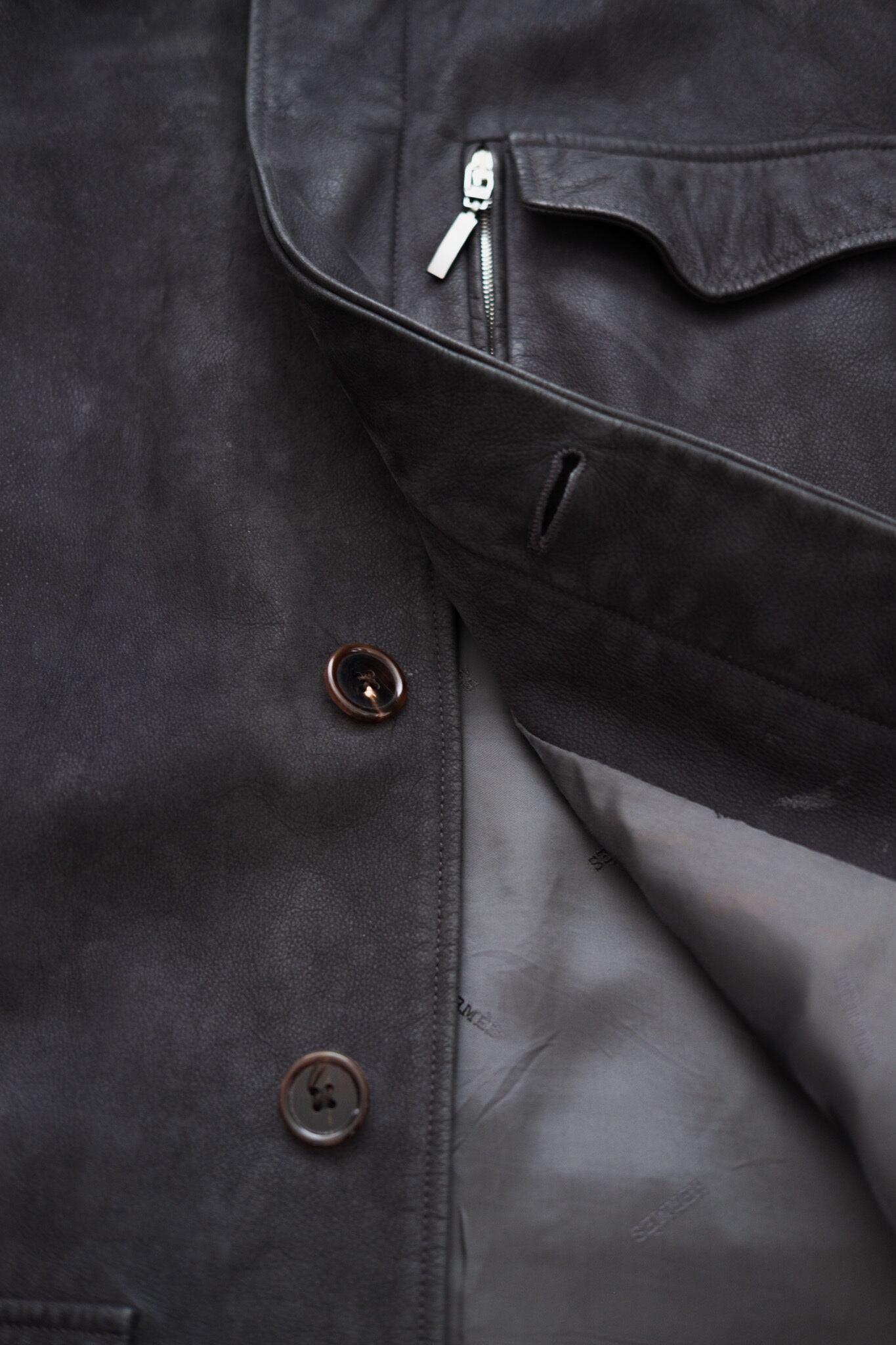 ぱっと見では黒と思われる方も多いかもしれませんが、実際はダークネイビーのバッファローレザーが経年でわずかに色抜けしたような、深みのある墨紺色。光の角度によってネイビーのニュアンスが浮かび上がる、極めて複雑な色調です。このトーンこそ、2000年代初頭のエルメスが追求していた「匿名性」「知性」「静謐さ」の象徴であり、着る者の存在を照らすのではなく、包みこむような佇まいを生み出します。