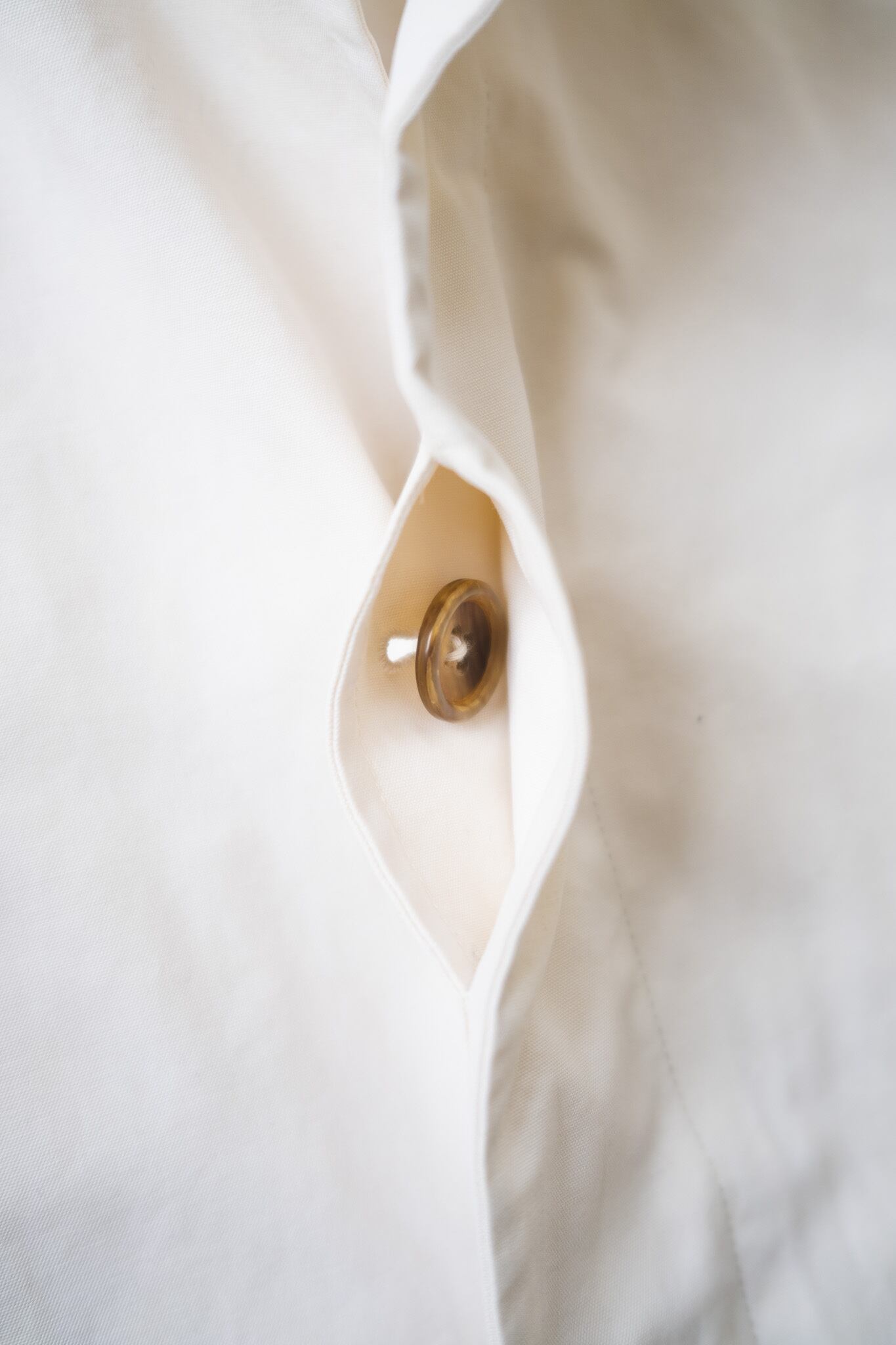 ボタンは深みのあるホーン調、ステッチ幅は2.8mm前後。