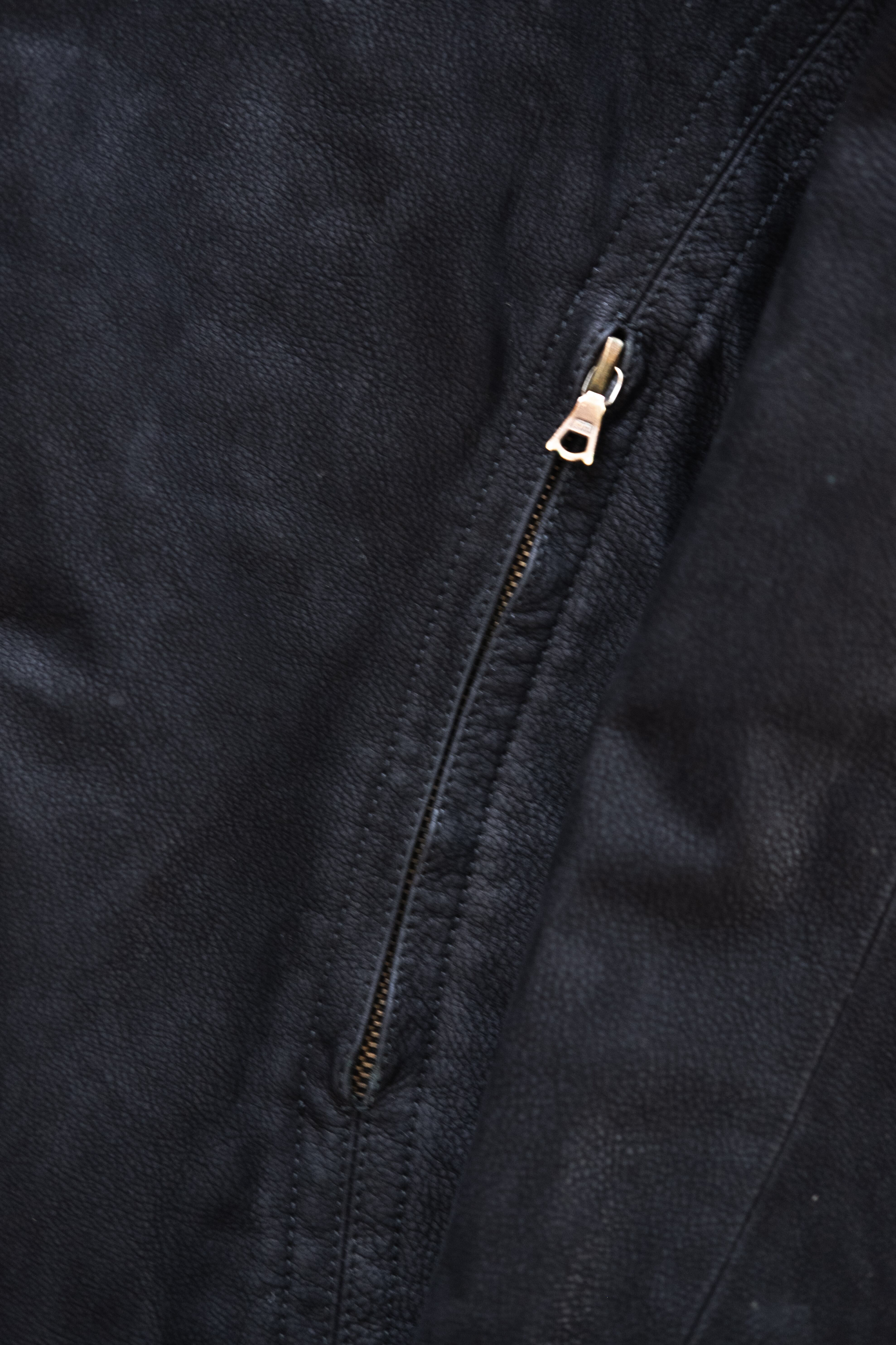 使用されているのは、上質なゴートスキン。ゴートレザーは非常に軽くてしなやかでありながら、繊維構造が密で摩擦に強く、日常的な使用に耐える素材です。このジャケットに選ばれたゴートスキンは、特にシボ感が強いもの。凹凸がはっきりとした革は、見た目の表情を豊かにするだけでなく、小さな擦れやキズを目立ちにくくする実用性も持ち合わせています。