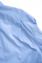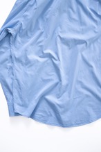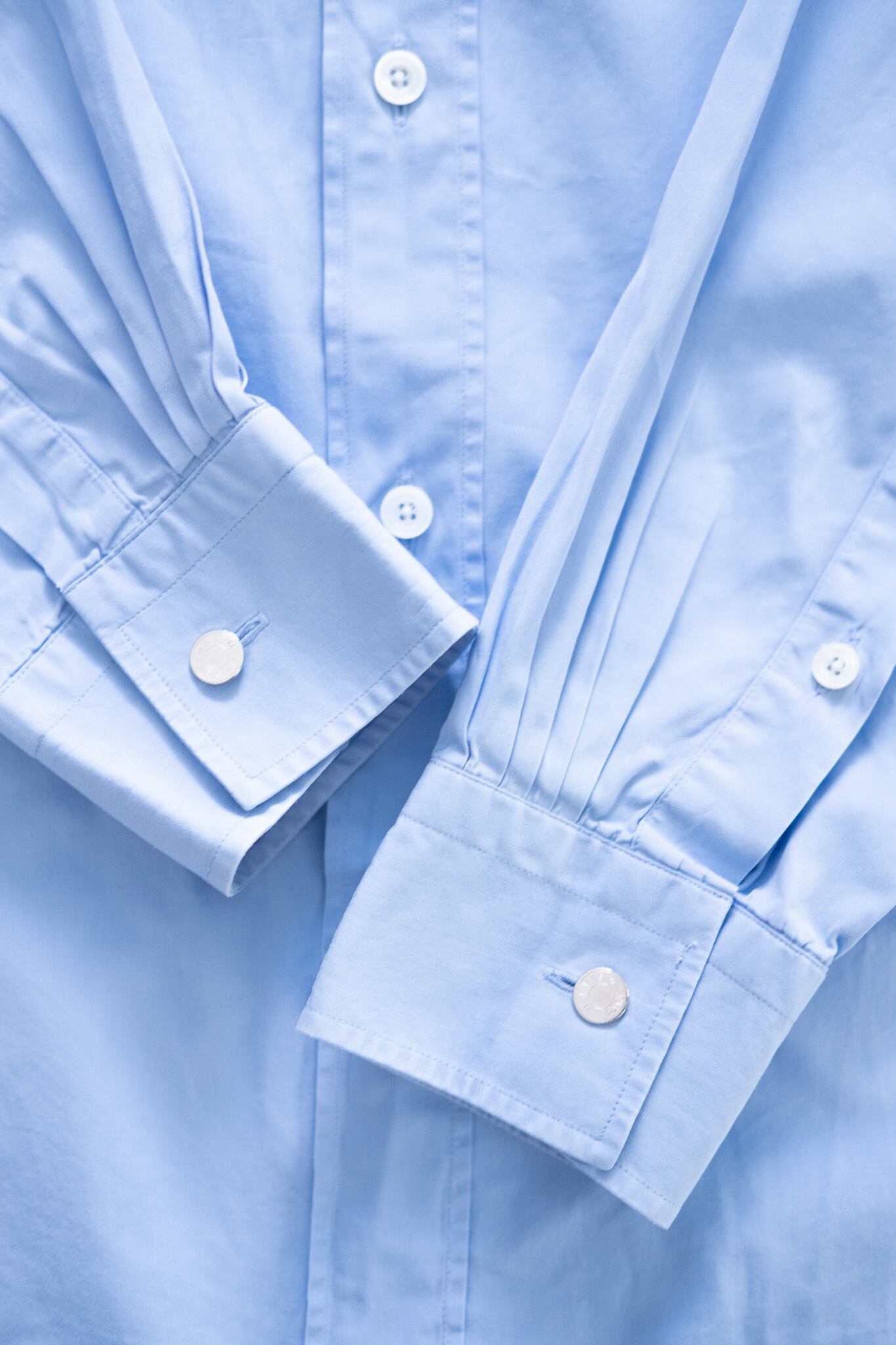 素材には、上質な高番手のコットンポプリンを使用。細密に織られた生地は、触れた瞬間にわかるなめらかさと、見た目にほのかに現れる上品な光沢が魅力です。パリッとした清潔感を保ちつつ、肌に沿って自然に落ちるドレープ感も秀逸。シワさえも、気品を纏った表情に変える力があります。