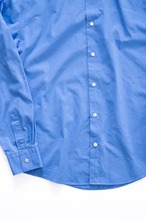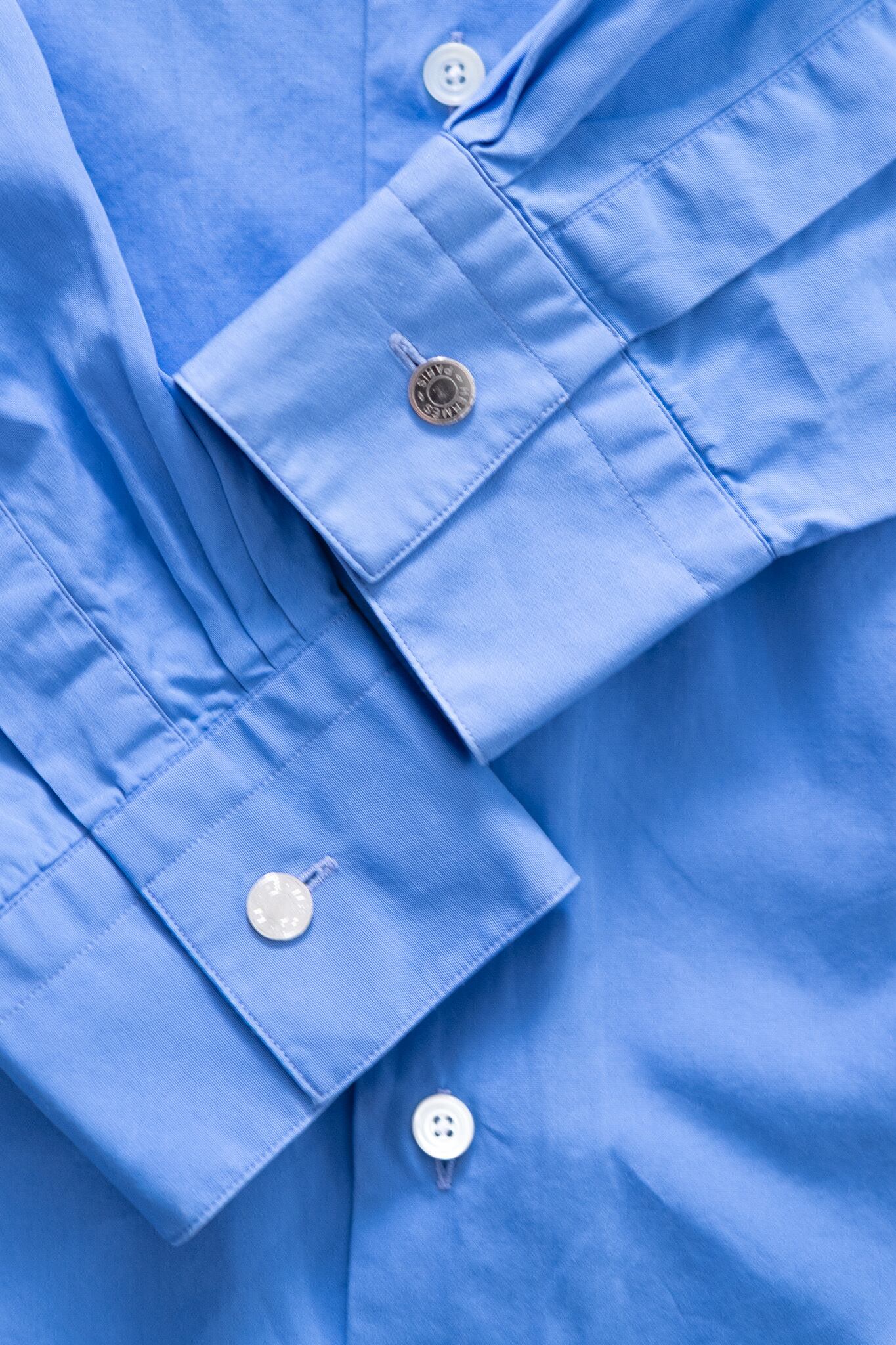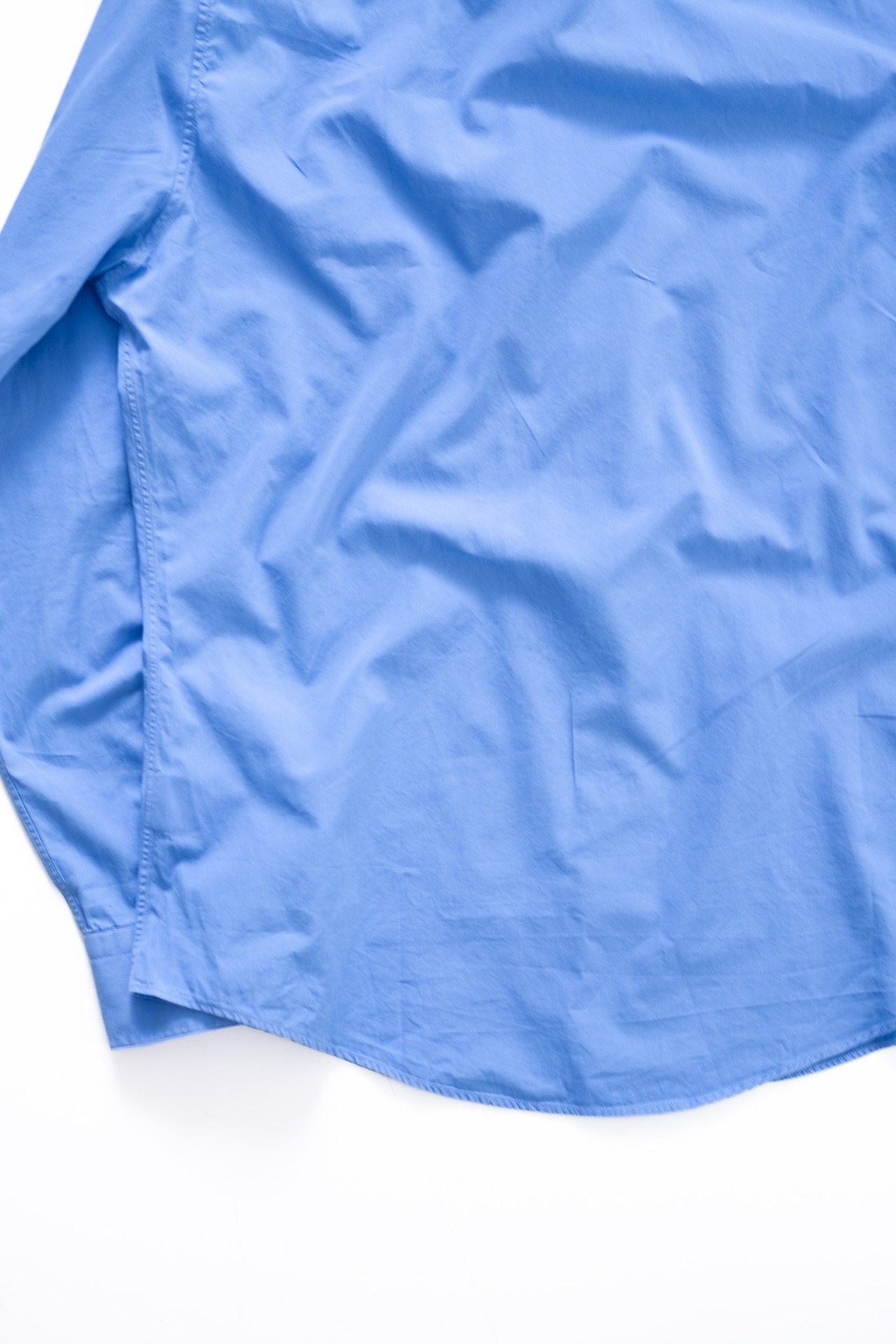 素材には、上質な高番手のコットンポプリンを使用。細密に織られた生地は、触れた瞬間にわかるなめらかさと、見た目にほのかに現れる上品な光沢が魅力です。パリッとした清潔感を保ちつつ、肌に沿って自然に落ちるドレープ感も秀逸。シワさえも、気品を纏った表情に変える力があります。