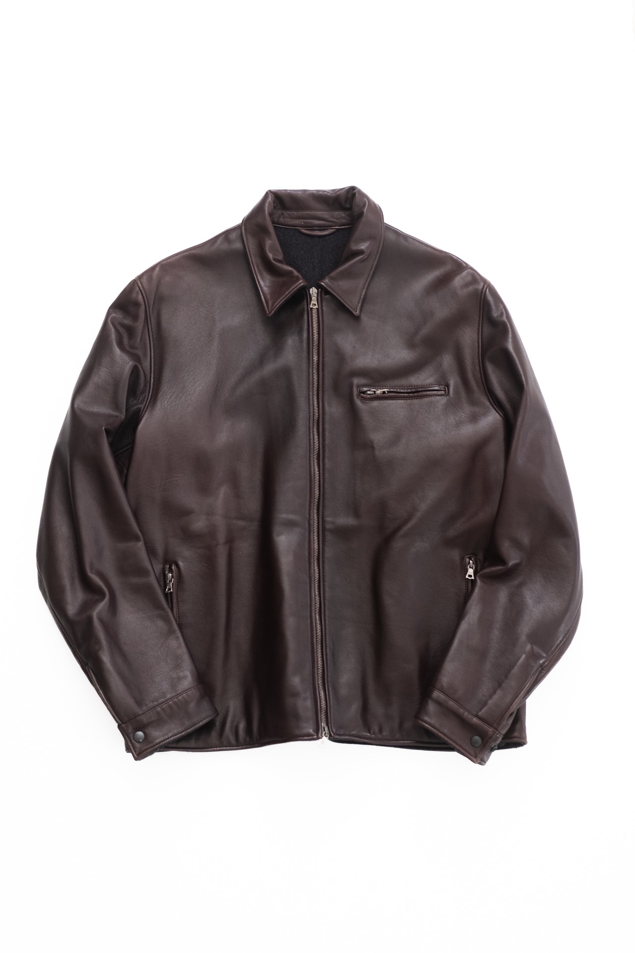 デザインは、クラシックなシャツカラーを備えたジップアップブルゾン型。余計な装飾を省いたミニマルな構成が、革そのものの存在感を引き立てます。フロントにはスイス製の高級ジップメーカー・riri社のメタルジップを採用。金属の噛み合わせは滑らかで、動作の精度と耐久性は長年の使用にも耐えうる仕様です。胸元と腰のポケットにも同じジップを配し、実用性とデザインの統一感を両立させています。