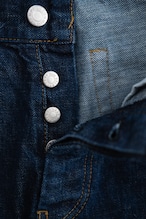 生地には100%コットンの赤耳セルビッジデニムを採用。裾をめくれば覗く赤耳は、ヘリテージを想起させる確かな証です。にもかかわらず、この一本が単なるヴィンテージの踏襲にとどまらないのは、無駄を排した設計にあります。バックポケットの形状はシャープで、リベットやパッチといった装飾的要素を極限まで削ぎ落とし、ボタンフライやステッチにさえ静けさが宿っています。伝統と革新の境界を探りながら、徹底して匿名性を保つ設計は、まさにHelmut Langならではのアプローチです。