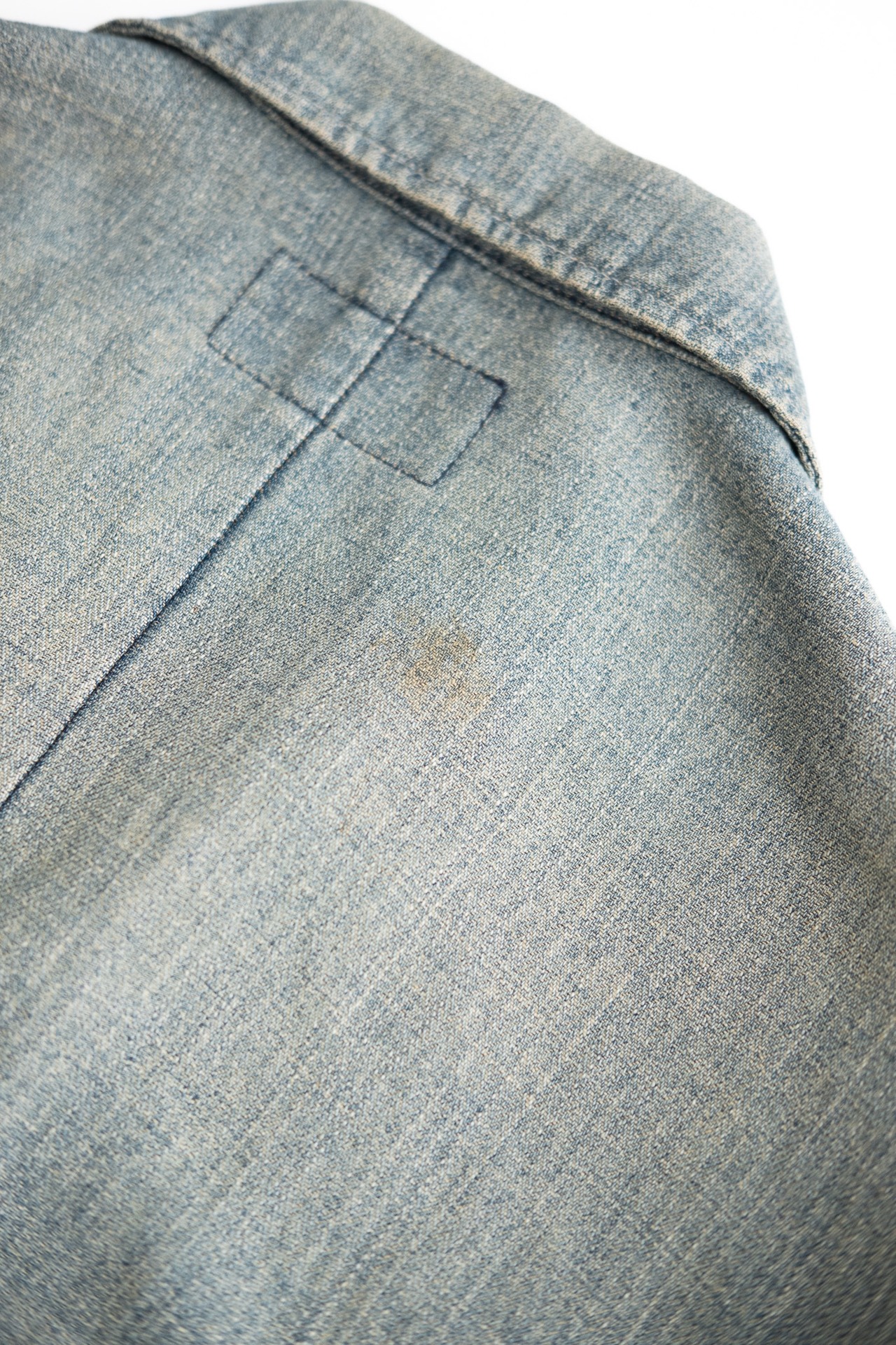まず目を引くのは、その生地。65%のコットンに35%のヘンプを掛け合わせ、ヘリンボーン織りで仕上げた特別なテキスタイルが採用されています。経年によって柔らかくフェードしたブルーグレーの表情は、デニムともリネンとも異なる独自の風合いを宿し、織り目が光を含むたびに細やかな陰影を見せてくれる。1990年代後半から2000年代初頭にかけて高まった“環境意識”を反映しつつ、素材自体をファッションの文脈にのせて提示した点に、このブランドの先進性を感じずにはいられません。