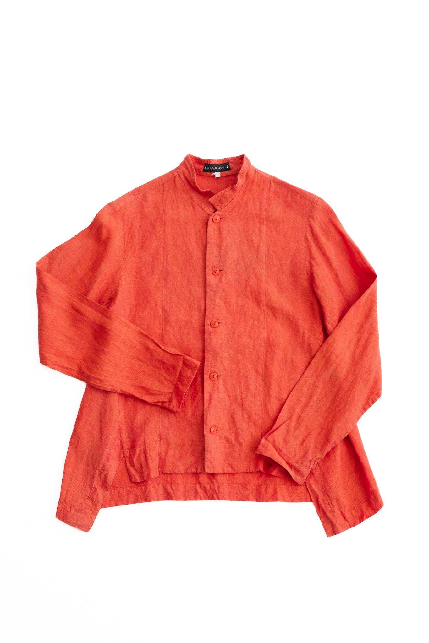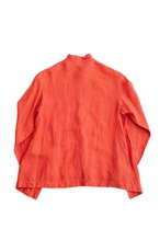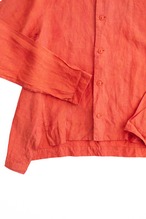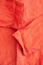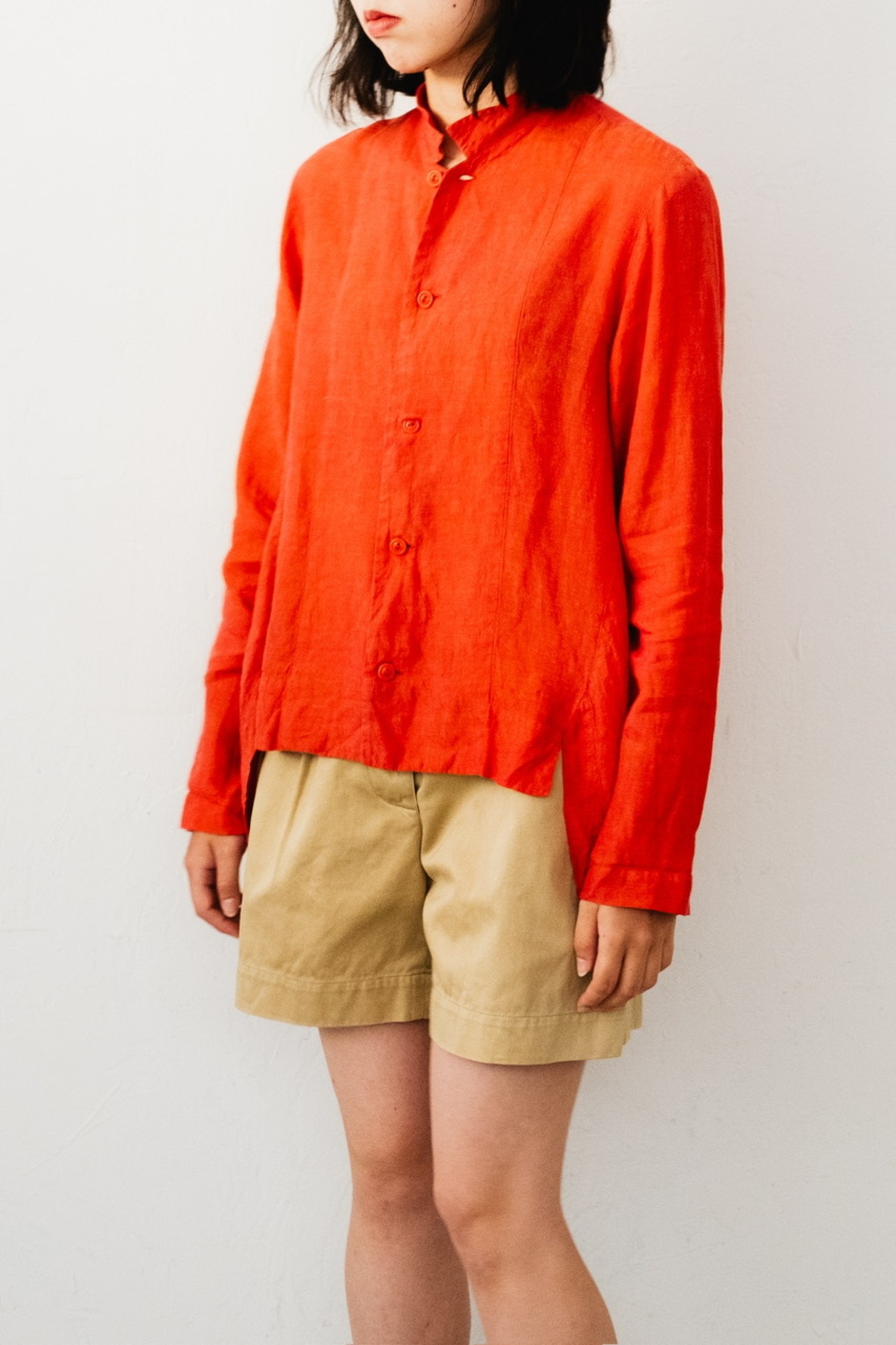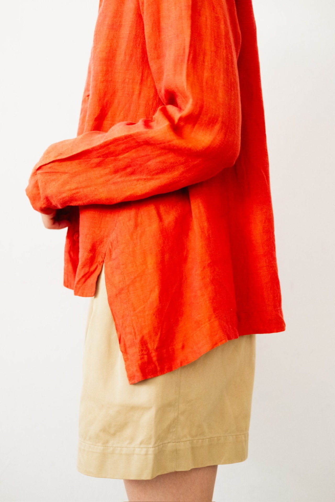 赤という色は、時に強すぎる。けれど、この一枚を前にすると印象は違う。鮮やかさの奥に陰影があり、素肌に触れる軽やかさがある。そして何より、裾まわりの構造がただの「リネンシャツ」という言葉では片づけられない存在感を放っています。