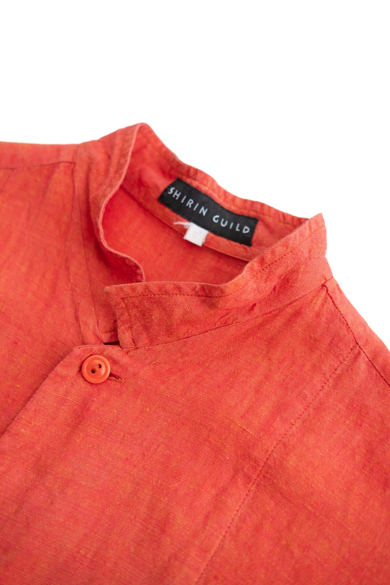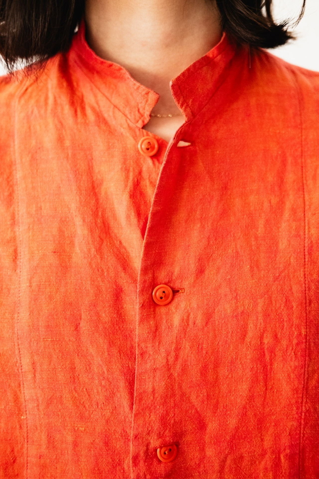 SHIRIN GUILDによる本作は、100%リネンを用いた平織生地。糸に残る自然なフシとネップが表情を生み、光の加減で赤からオレンジに転じるメランジ調の発色が特徴です。薄手で透け感があるのに決して頼りなくならないのは、リネン特有の張りと落ち感が共存しているから。盛夏に涼をもたらすだけでなく、湿度の高い時期にも肌離れ良く着られる実用性を備えています。