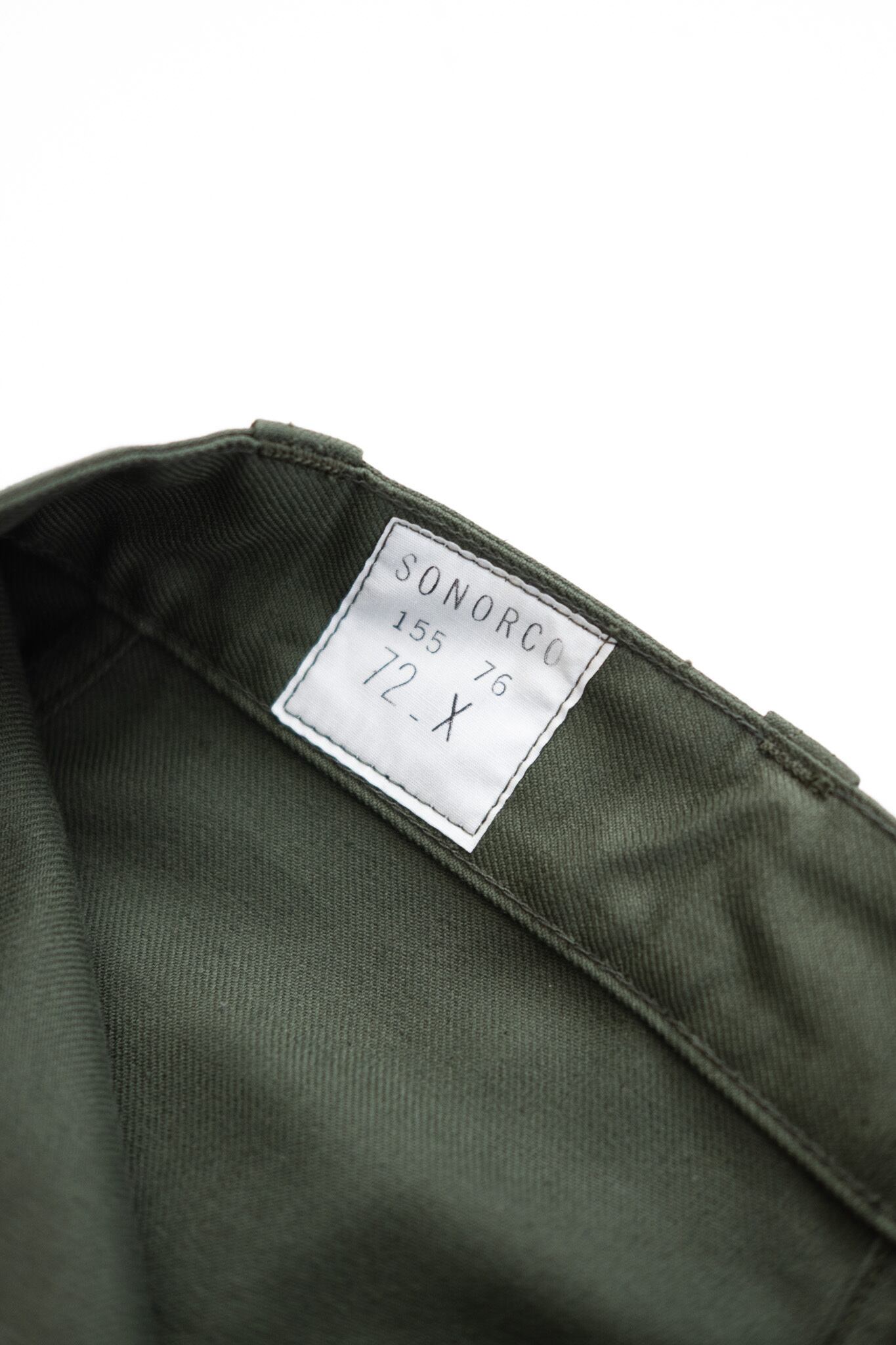 フランス軍のフィールドトラウザーを語るとき、多くの人の脳裏に浮かぶのは「モールスキン生地にカーキのM64」。重厚な質感とずっしりとした存在感こそが、定番のイメージとして広く知られています。しかし、ここにある一本はその常識を大きく裏切ります。生地はM47前期と同じコットンツイル。そして色調は陸軍カーキではなく、空軍モデルに通じる深みあるオリーブグリーン。つまり、M47とM64という二つの時代をまたぎながら、なおかつカラーリングまでもが異質であるという、極めて珍しい個体なのです。