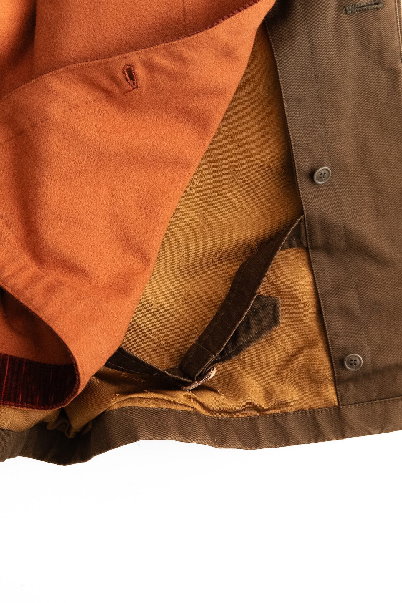 外観は一見して端正なフィールドコートですが、細部に宿る工夫はARNYSならでは。表地には高密度のコットンギャバジンを用い、しなやかでありながらも風雨をしっかりと防ぐ実用性を備えています。裏地には鮮やかなオレンジのウールシルクフランネルを全面に配し、防寒性はもちろん視覚的にも力強い印象を残す仕上がり。ポケットや前立ての裏側には深いバーガンディの太畝コーデュロイを用い、摩耗を防ぎつつクラシックな温もりを演出します。素材使いにおけるこの二重三重の機能性と美意識の融合は、まさにARNYSらしい哲学の表れといえるでしょう。