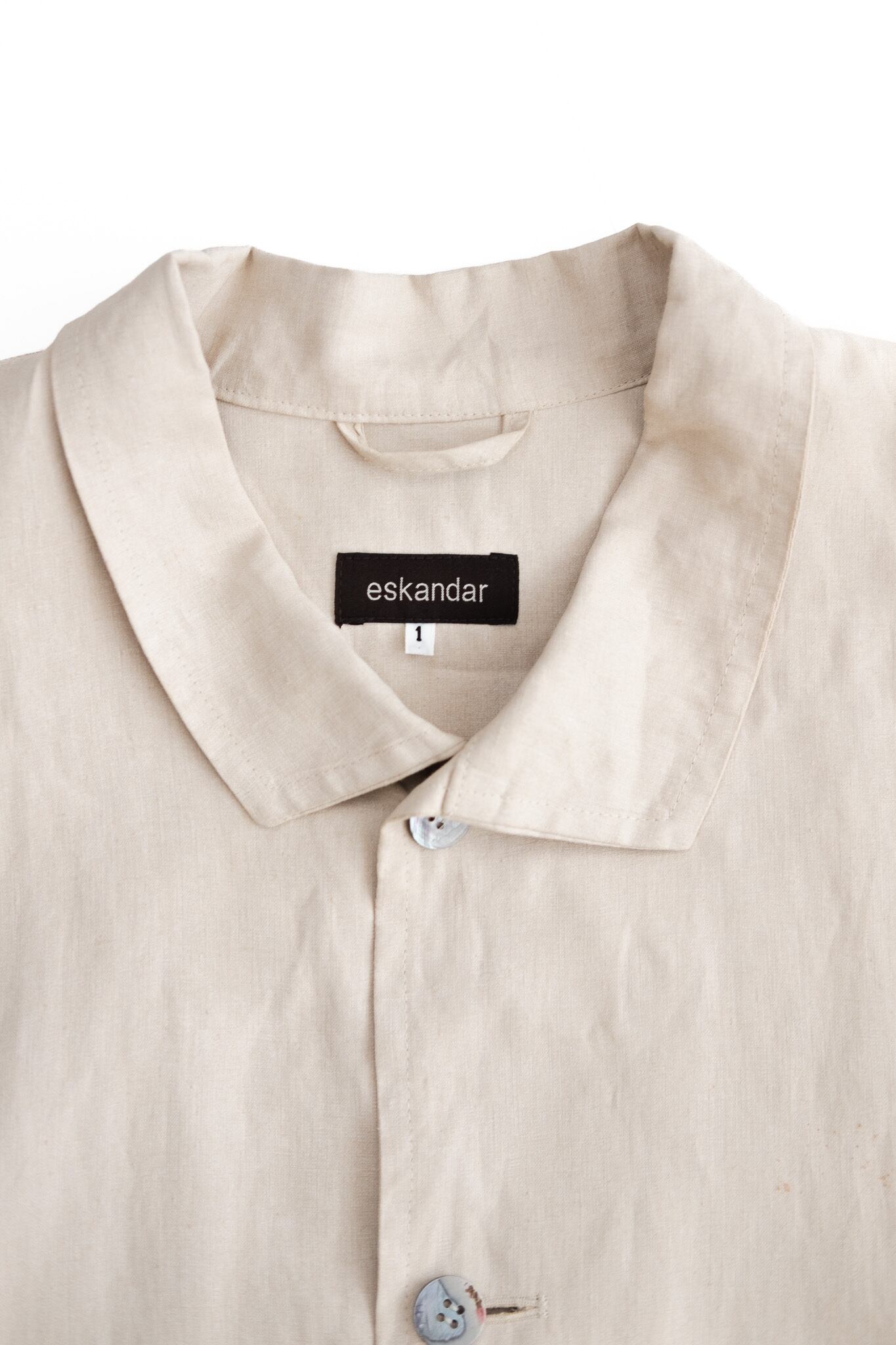 デザインは非常にミニマル。首元は小ぶりなシャツカラー、フロントはボタン留めのシンプルな構造。腰の位置に大ぶりのフラップ付きポケットを備えており、ワークウェア的な実用性とラグジュアリーウェアならではの洗練を両立させています。直線的なシルエットで構築されていながら、身体を締め付けず、むしろ余白を持たせることで自然なドレープを描きます。オーバーサイズでありながら不思議とだらしなさがなく、着る人の個性に寄り添うのが eskandar の真骨頂です。