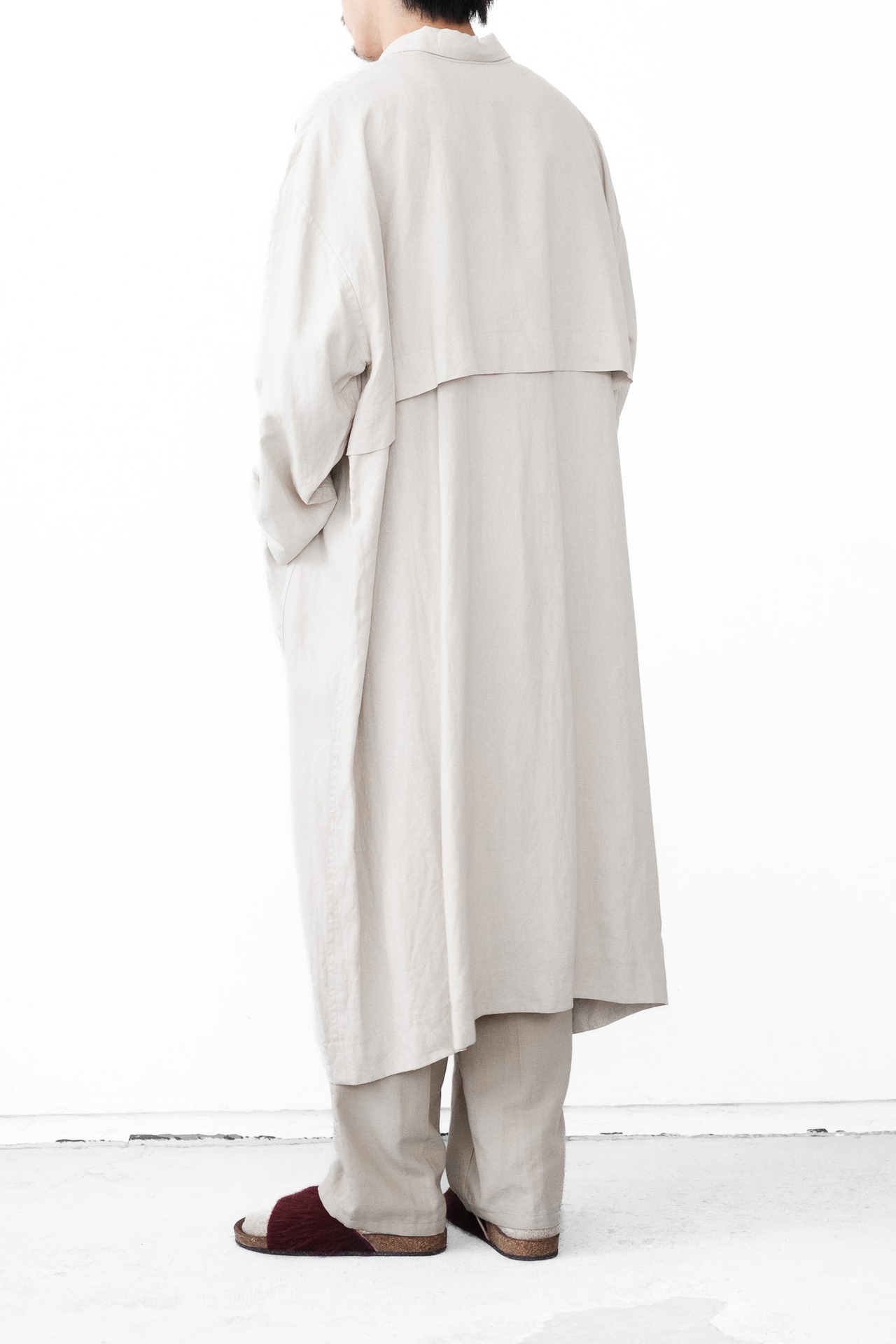 シルエットは膝下にかかるロング丈。春夏には軽い羽織としてTシャツやシャツの上に重ねても涼しく、秋口にはニットと合わせてもサマになる万能さを備えています。ゆったりとした袖付けはレイヤリングにも対応し、ユニセックスな提案としても魅力的です。