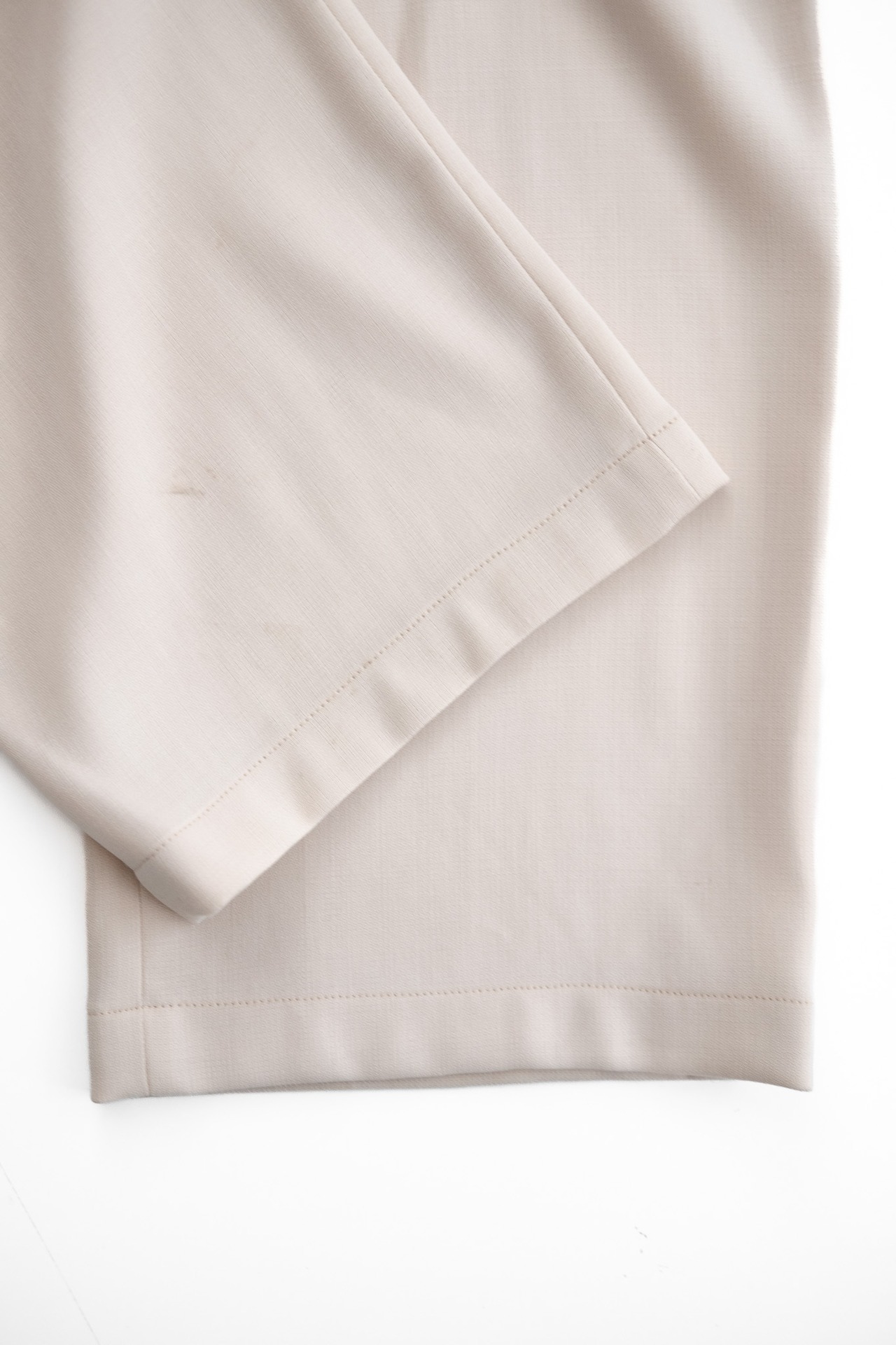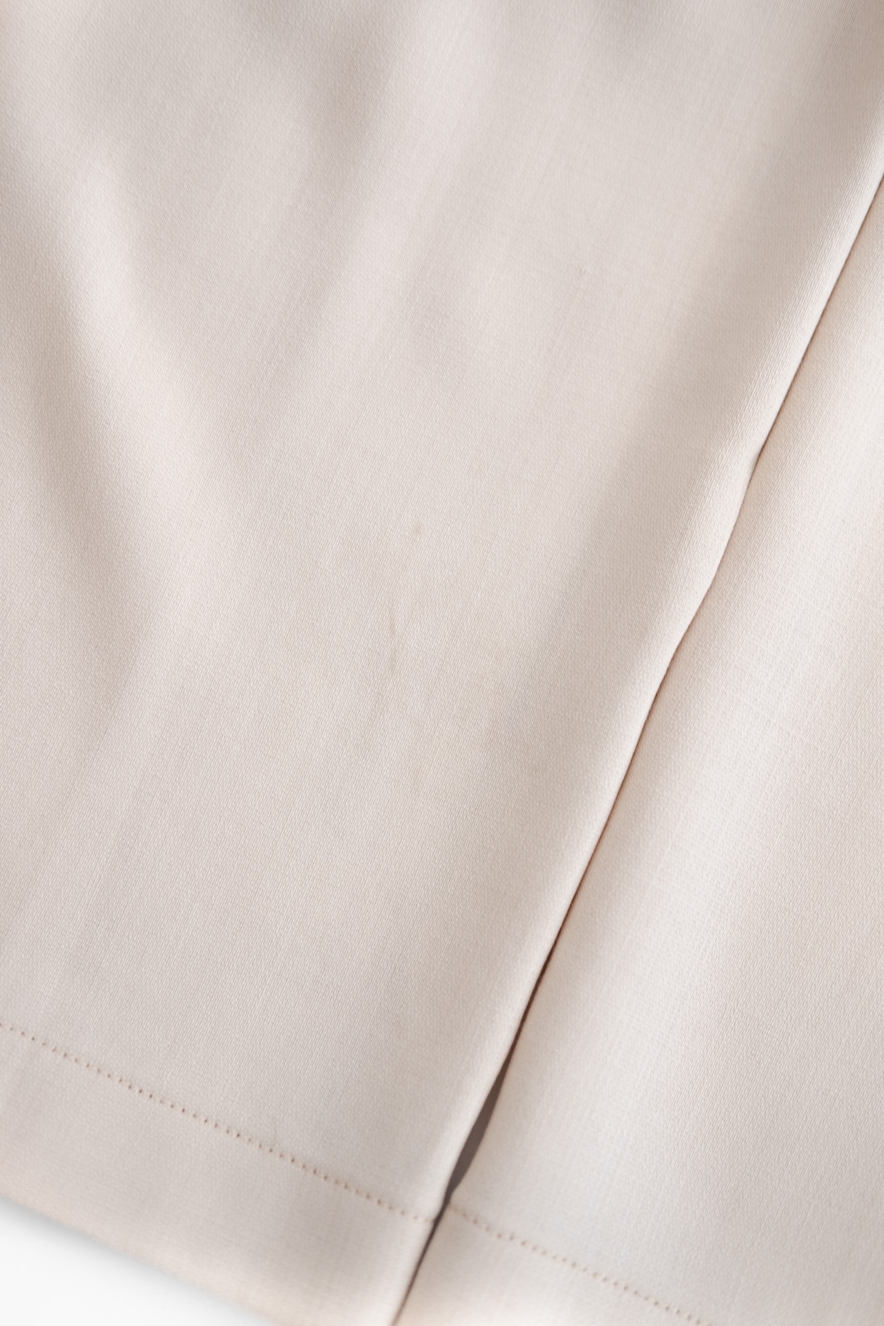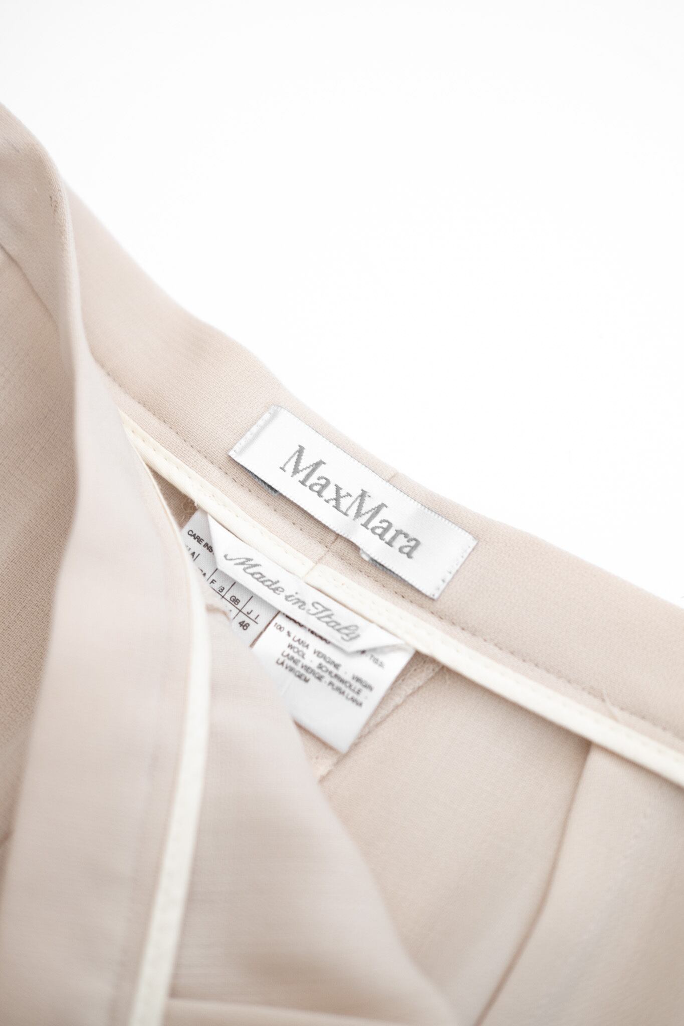 カラーは、アイボリーに近いライトベージュ。ニュートラルでありながら、光を含むたびに陰影を見せる色合いは、シーズンを問わず幅広いスタイリングに適応します。シャツやブラウスを合わせればオフィスやフォーマルシーンに、カシミヤニットやリネンシャツと合わせればカジュアルで都会的な表情に。スタイルの軸となりながらも、組み合わせ次第で自在に変化してくれる懐の深さこそが、MaxMaraが掲げる「タイムレスな日常着」の真価です。