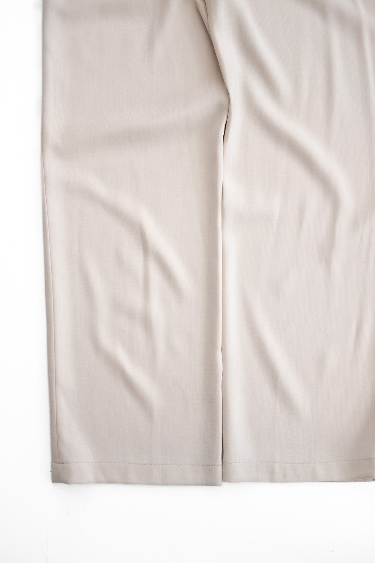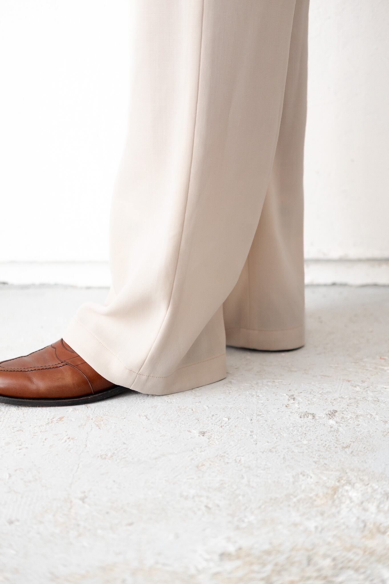 そのエッセンスを体現するのが、本作のスラックスです。ブランドのメインラインに属する本アイテムは、100%ヴァージンウールを贅沢に使用。リサイクルではない一番最初に刈り取られた羊毛のみを用いることで、軽やかでしなやか、かつ上品な光沢を備えた生地に仕上げられています。実際に足を通すと、繊細な繊維が生み出す滑らかなタッチと、美しく落ちるドレープが際立ち、素材選びに妥協しないブランドの姿勢が伝わってきます。