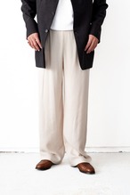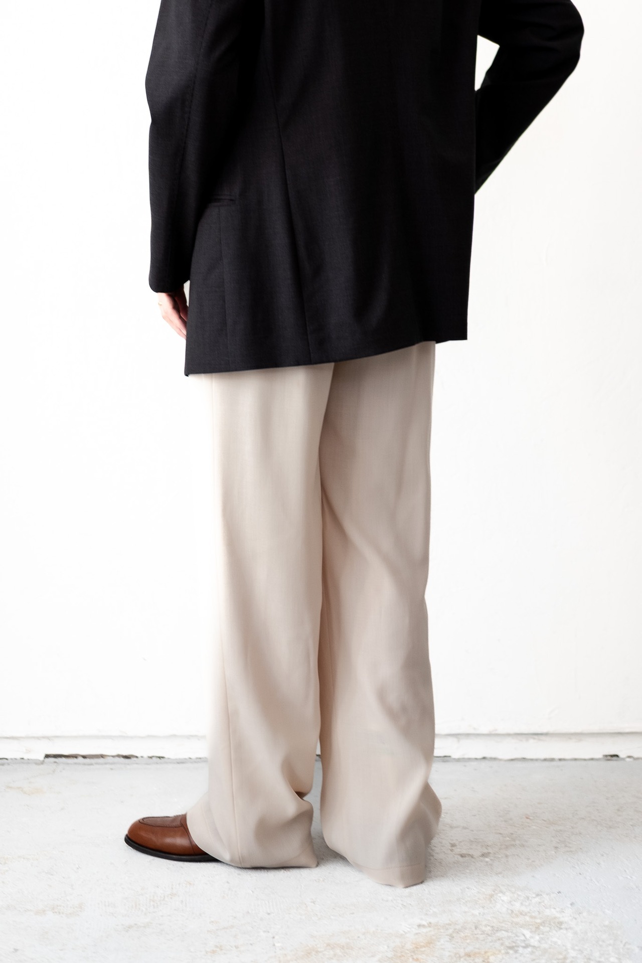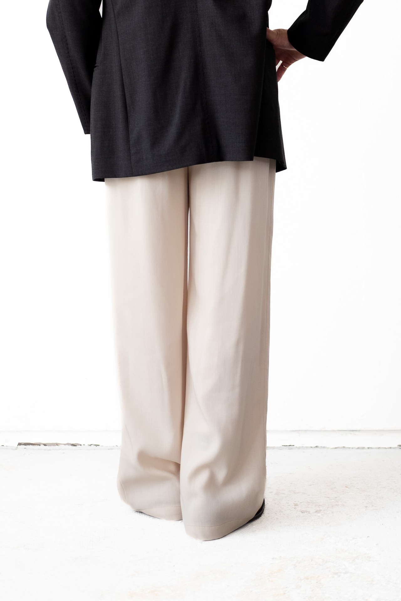 ディテールにも、MaxMaraならではの哲学が宿ります。フロントには余計な装飾を排し、サイドにジップとボタンを配した仕様。腰回りをフラットに保つことでトップスをタックインした際のシルエットが際立ち、洗練された印象を与えます。また、ゆとりのあるワイドストレートシルエットにセンタープレスを加えることで、リラックス感と端正な美しさを両立。デザインは極めてシンプルでありながら、穿く人の佇まいに静かな強さを与える仕立てになっています。
