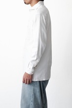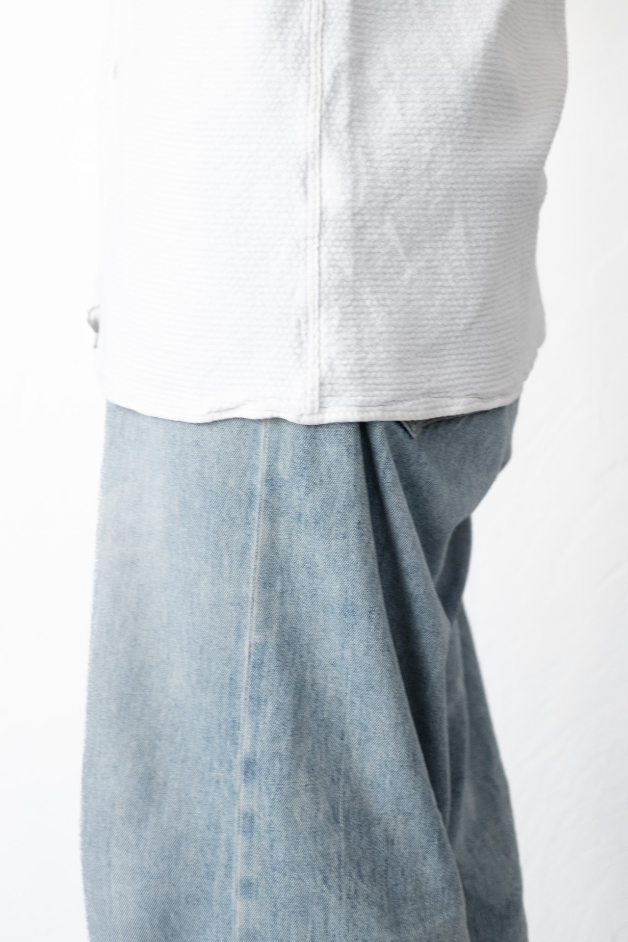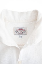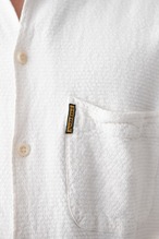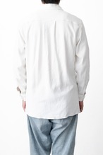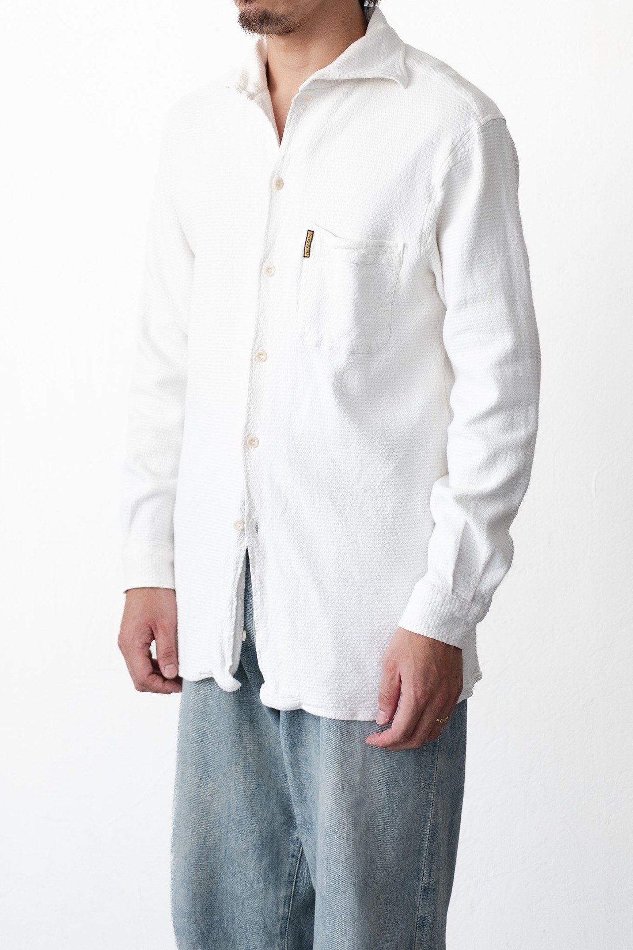 まず目を引くのは、生地そのものの質感。素材はコットン50%とビスコース50%を掛け合わせた特別な混紡で、立体的なワッフル調のテクスチャーが表情豊かに浮かび上がります。一般的なコットンシャツが持つパリッとした張りとは異なり、ビスコース由来の落ち感と柔らかさが加わることで、肌に心地よく沿いながらも上品な陰影を描くのが特徴です。この素材使いは、1990年代後半から2000年代初頭にかけての「快適性とエレガンスの融合」を求める時代背景を色濃く反映しています。