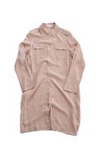 デザインのベースとなっているのはサファリシャツ。20世紀初頭、アフリカや中東への探検・滞在に向けて仕立てられたこの形は、日差しを防ぎつつ動きやすさを備えた実用服として生まれました。肩章やフラップポケットはその典型的なディテールであり、本来は実用のために付けられたもの。しかし、このドレスではそうした要素が「軽量なシルク」という真逆の素材と組み合わされることで、無骨さではなく洗練を引き出す役割を果たしています。さらに、生地が二重になる前立てやポケット部分では自然と濃淡が生まれ、構造自体がコントラストを描くよう設計されているのも巧みなポイントです。