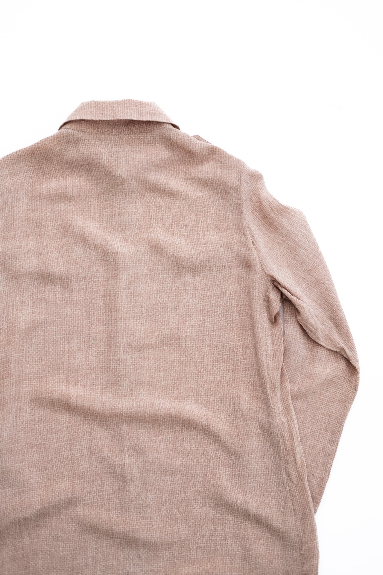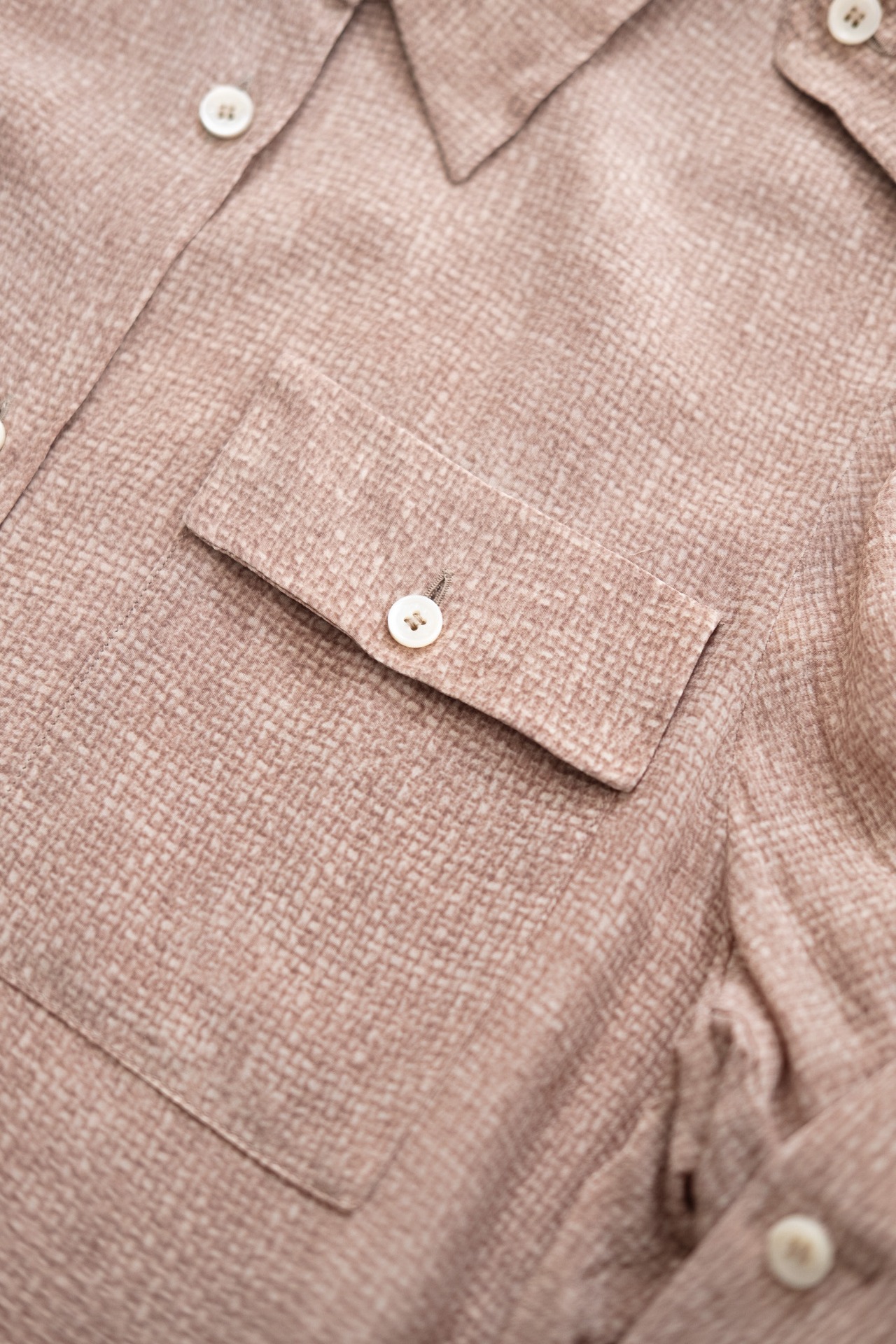 柄はリアルなアニマルパターンではなく、ニュアンスのある抽象表現。クロスハッチのような微細な繰り返し模様は、光の当たり方によってわずかに表情を変え、見る者に奥行きを感じさせます。サファリシャツという「探検着」の背景に、パイソン柄のような野性味を忍ばせつつ、最終的にはシルクの光沢がそれを都会的なムードへと昇華しているのです。ここにこそCELINEらしい知性とモードの解釈が息づいています。