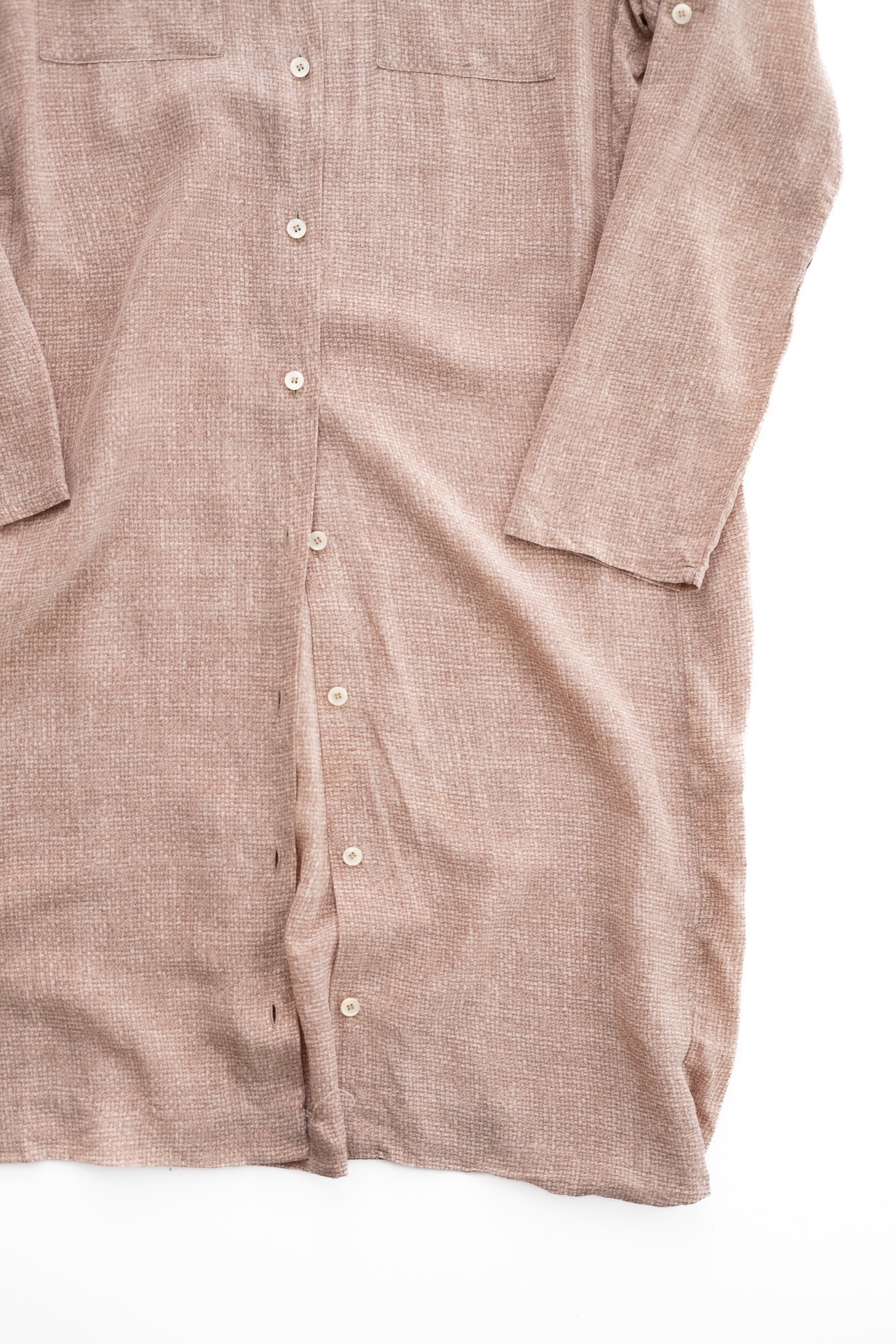 シルエットは直線的でありながらも柔らかく落ちるストレートライン。膝にかかる着丈は、ワンピースとしても羽織りとしても使える絶妙な長さです。裾は深くラウンドを描き、歩くたびに裾線が揺れて縦のドレープを強調。透け感があることで、軽やかさだけでなく、インナーやボトムとのレイヤードによってさまざまな表情を引き出せる構造になっています。透けるという要素は欠点ではなく、むしろこのドレスの最大の魅力。インナーの色や素材次第で、スタイルの幅を大きく広げてくれるのです。