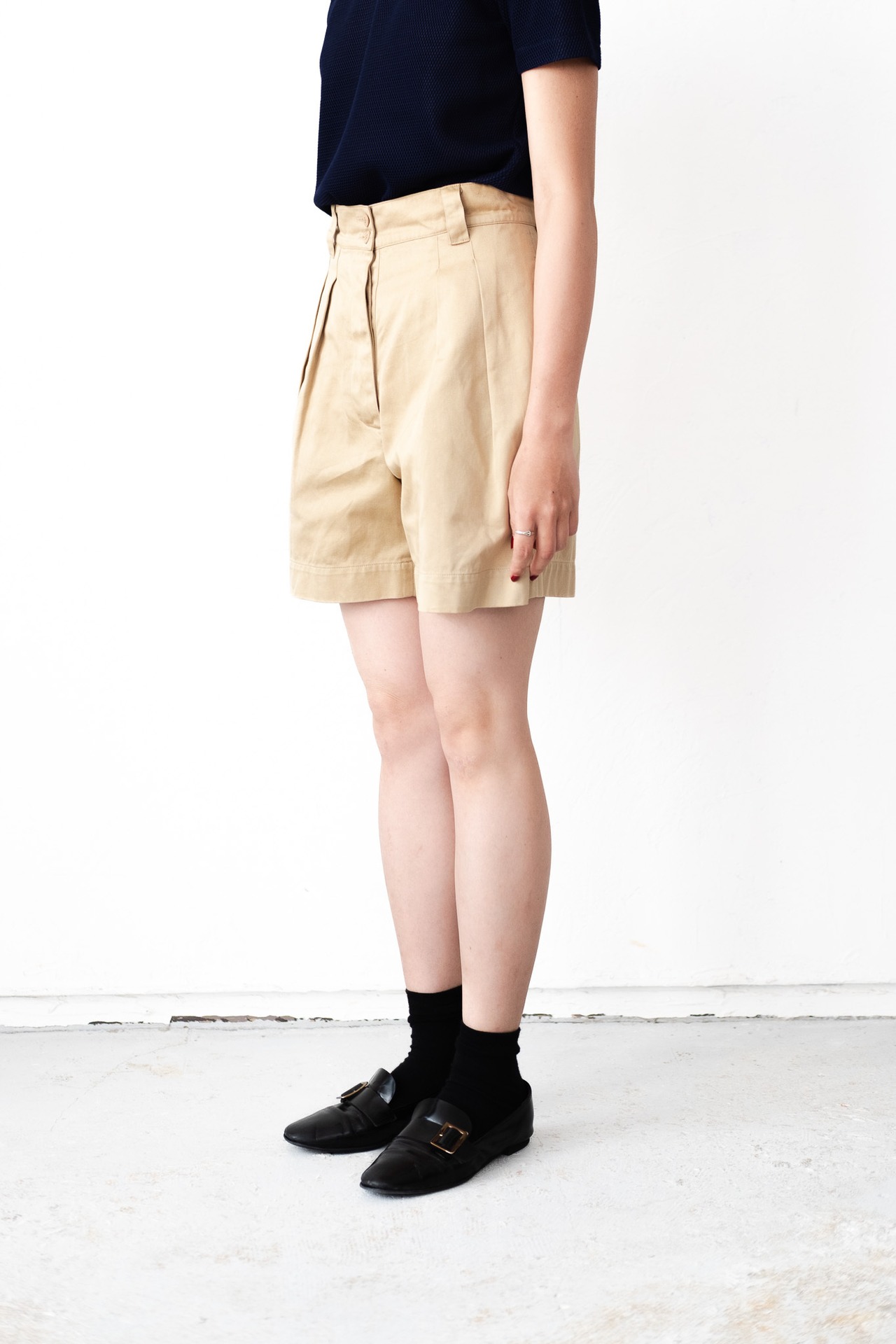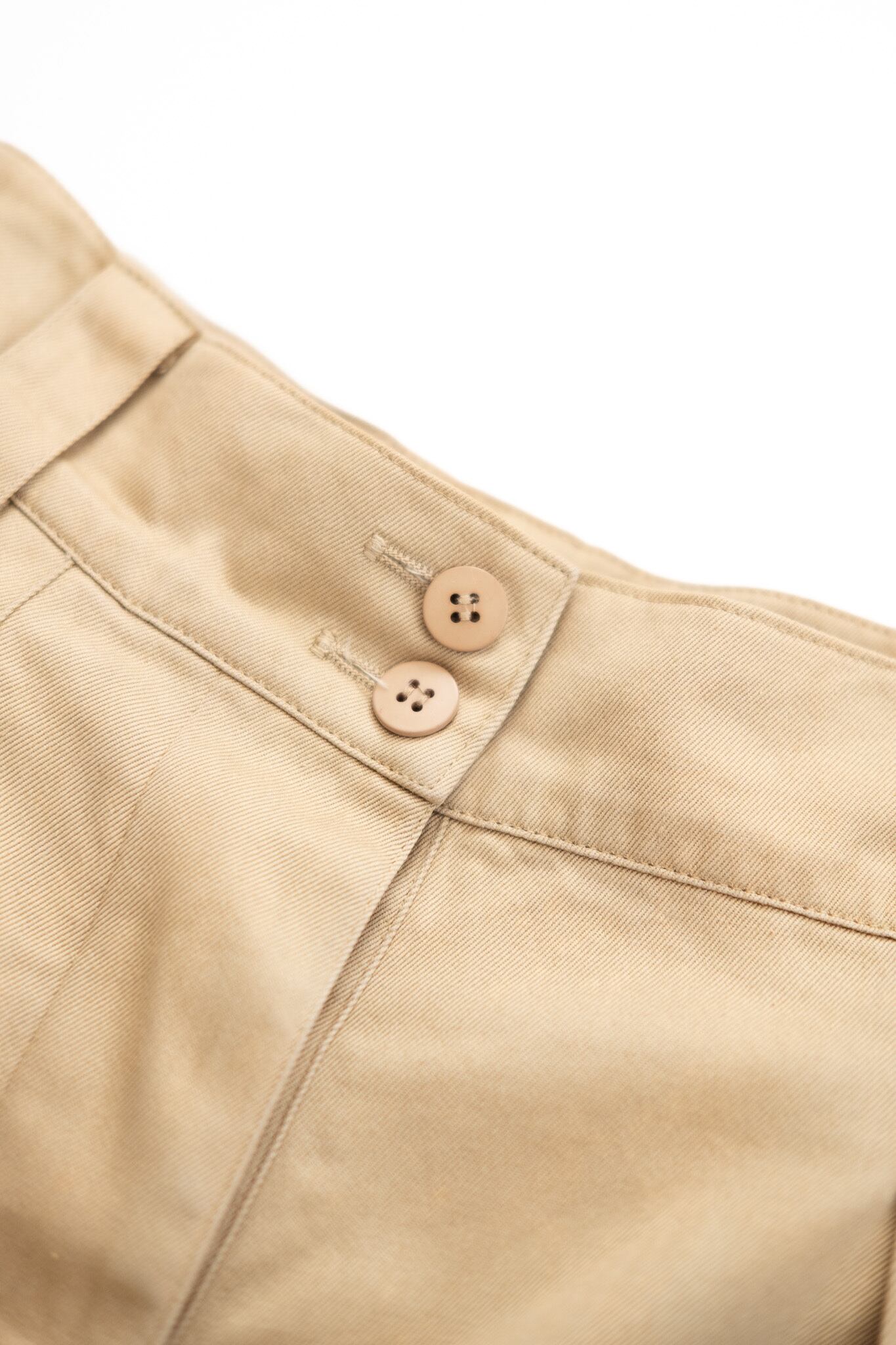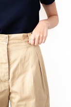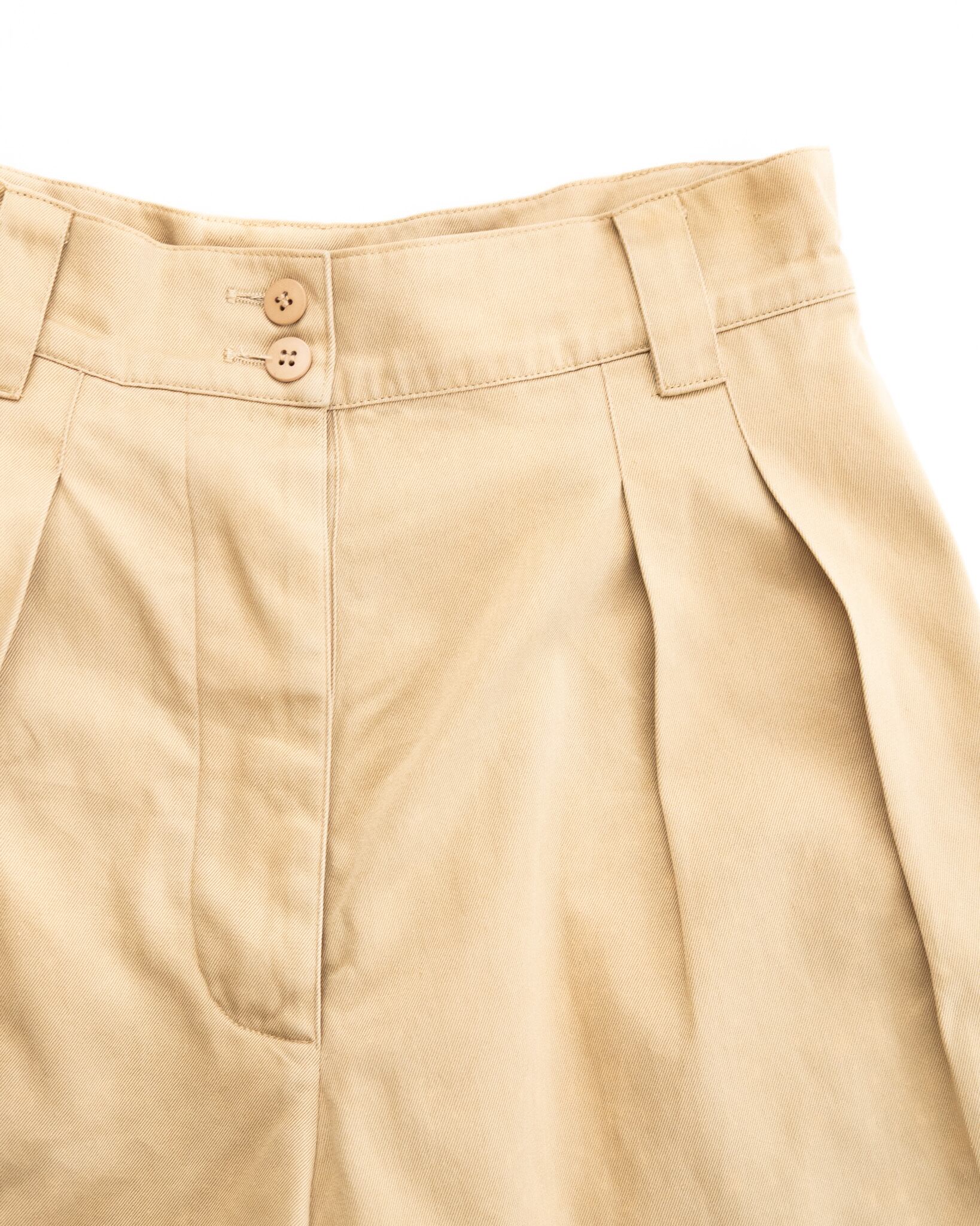 ご紹介するのは、そんなALAÏAが手掛けたハイウエストショーツ。フランス軍のM-52チノを思わせる深い股上と2本のプリーツが特徴で、腰回りに立体的なゆとりを生みつつ、裾へ向かって美しいドレープを描きます。ワタリに十分なボリュームを持たせたシルエットながら、穿くとすっきりと脚が長く見えるのは、アライアならではの計算されたパターンメイキングの妙。ウエストをきゅっと高い位置でマークすることで、日常のスタイリングに自然と女性らしいバランスをもたらしてくれます。