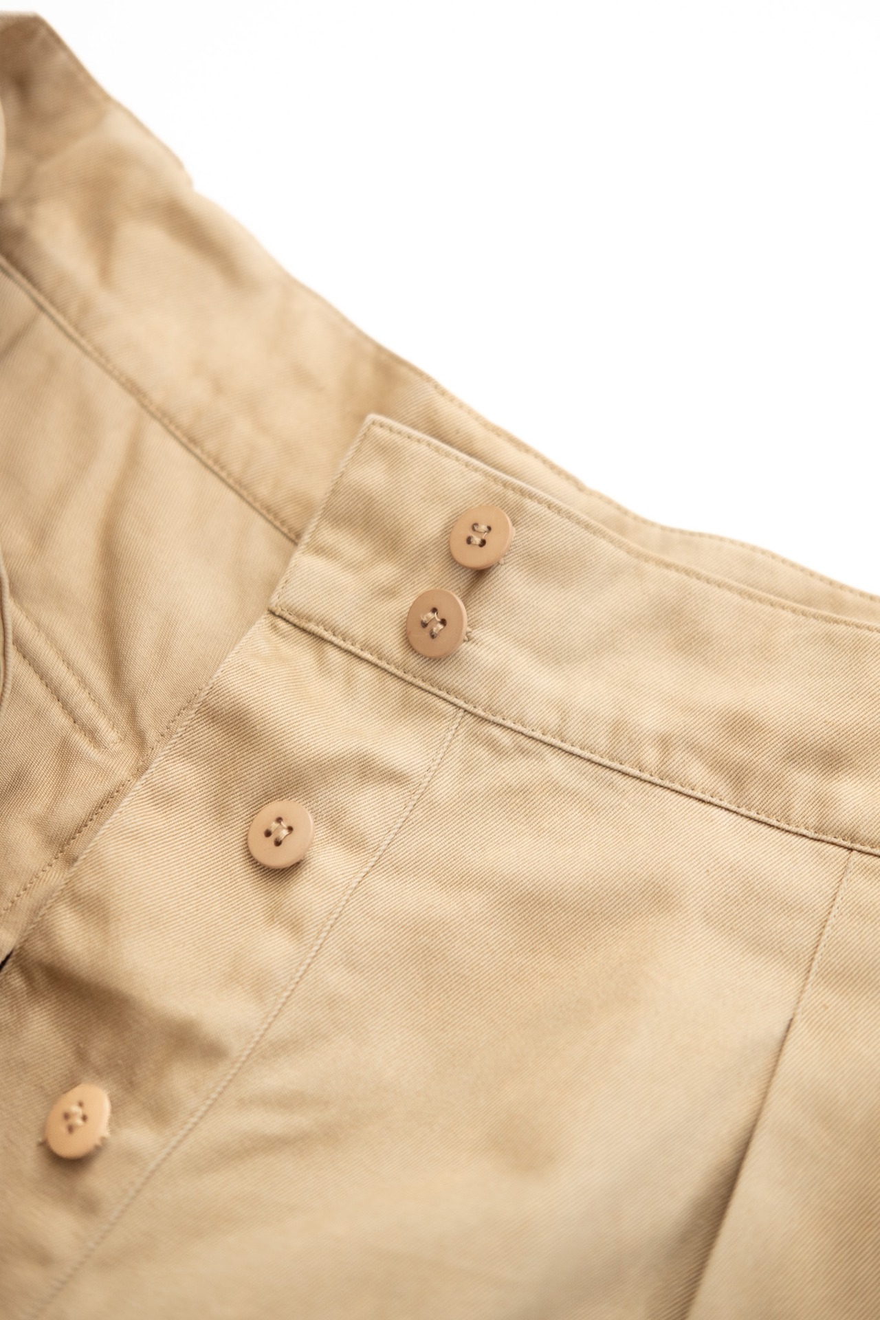 素材は上質なコットンツイル。程よい厚みとマットな質感があり、ミリタリー由来のチノクロスを思わせるタフさを備えつつも、フレンチメゾンらしい品の良さが漂います。バックスタイルには片側だけフラップ付きのポケットを配し、ワークウェアのディテールをモード的に再構築。アシンメトリーなデザインがさりげない個性を演出し、シンプルなショーツでありながら存在感のある一着に仕上がっています。